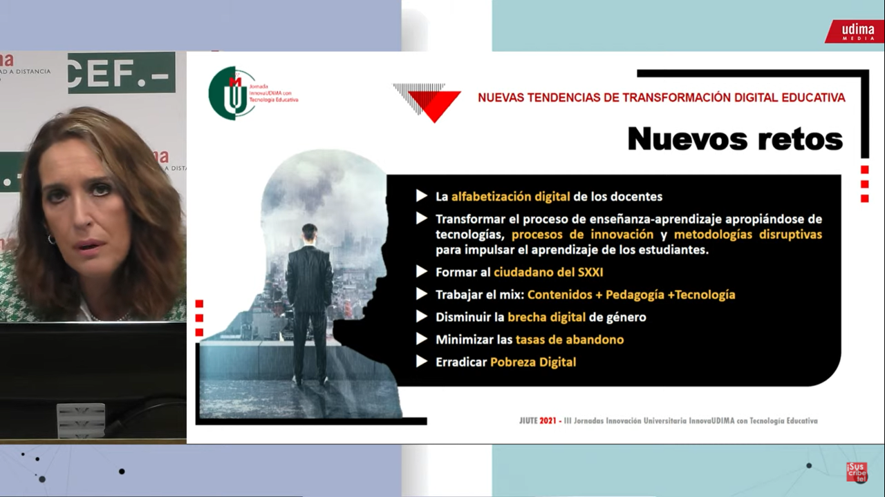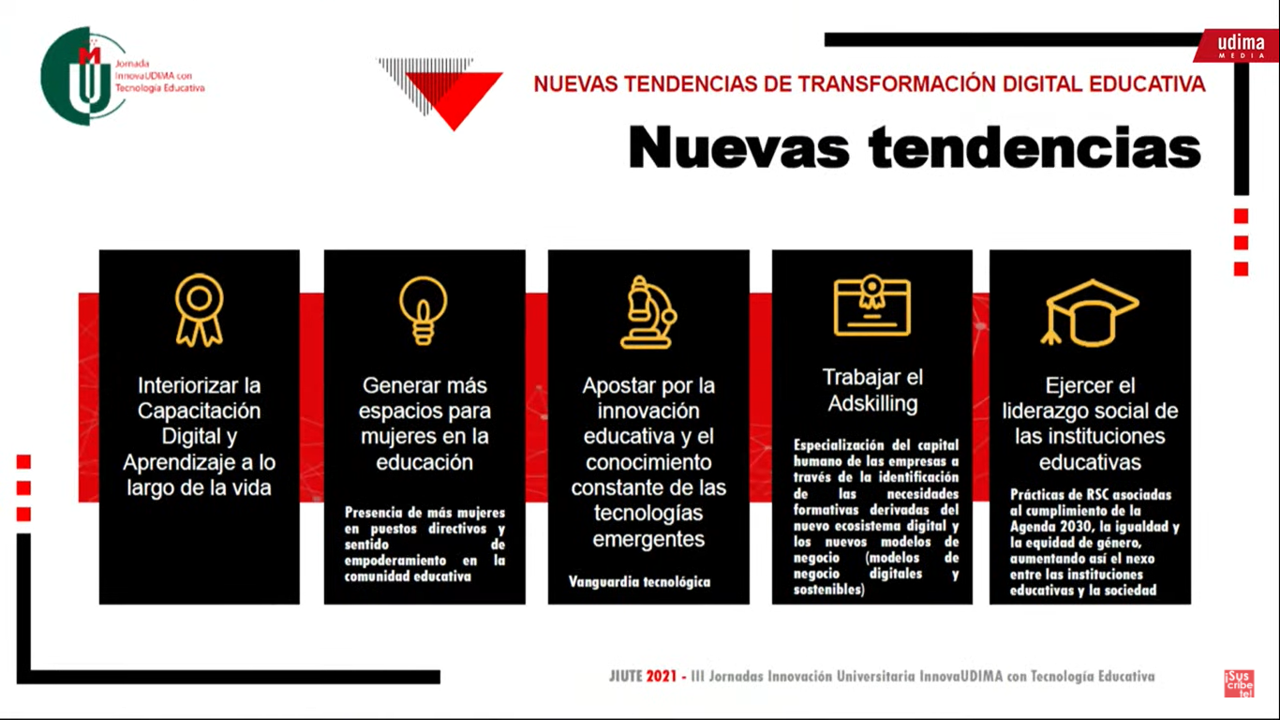 "La innovación es parte de nuestro ADN como universidad y este tipo de jornadas son un claro ejemplo de ello". Con una frase tan asertiva como veraz, Ana Landeta comenzaba la ponencia inicial de las III Jornadas de Innovación en Tecnología Educativa de la UDIMA, que se celebra los días 21 y 22 de octubre. La profesora de la UDIMA ha centrado su exposición en repasar las Nuevas tendencias de Transformación Digital Educativa. Para ello ha acudido al contexto que nos deja la pandemia, así como los nuevos enfoques y políticas en materia de educación de la estrategia España Digital 2020-2025.