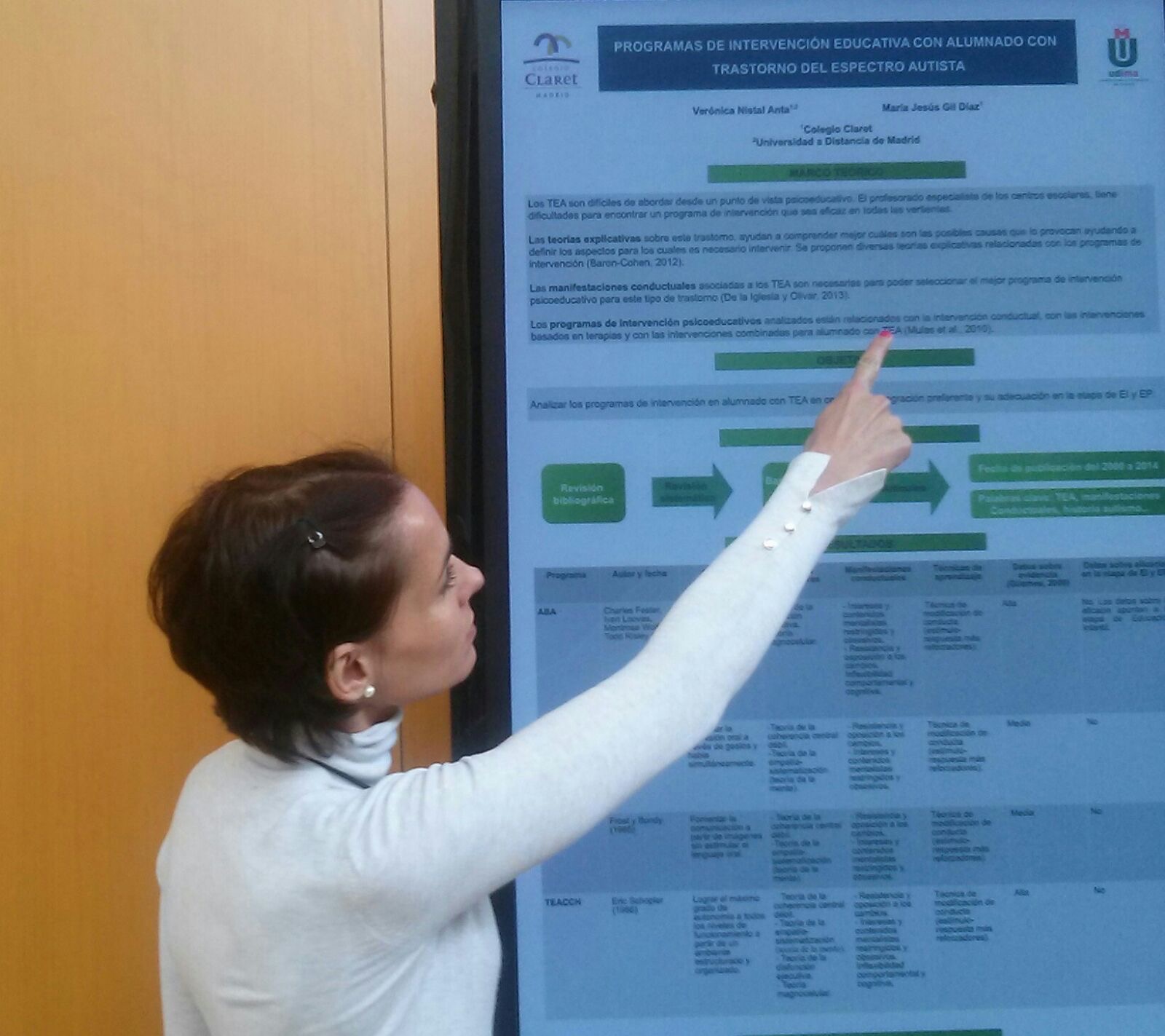 El Auditorio y Centro de Congresos de Murcia acoge estos días el IV Congreso Internacional de Autismo, cuyo comité de honor está presidido por sus Majestades los Reyes de España y en el que participarán como ponentes expertos de la talla de Baron-Cohen, Stefani Bodison, Isabel Paula y Artigas, entre otros. En este marco, Verónica Nistal expuso este sábado, día 25, un póster y realizó la comunicación del mismo titulado 'Programas de intervención educativa con alumnado con Trastorno del Espectro del Autismo (TEA)', estudio que comprende una revisión bibliográfica sobre los programas de intervención empleados para alumnado con TEA en edad escolar.