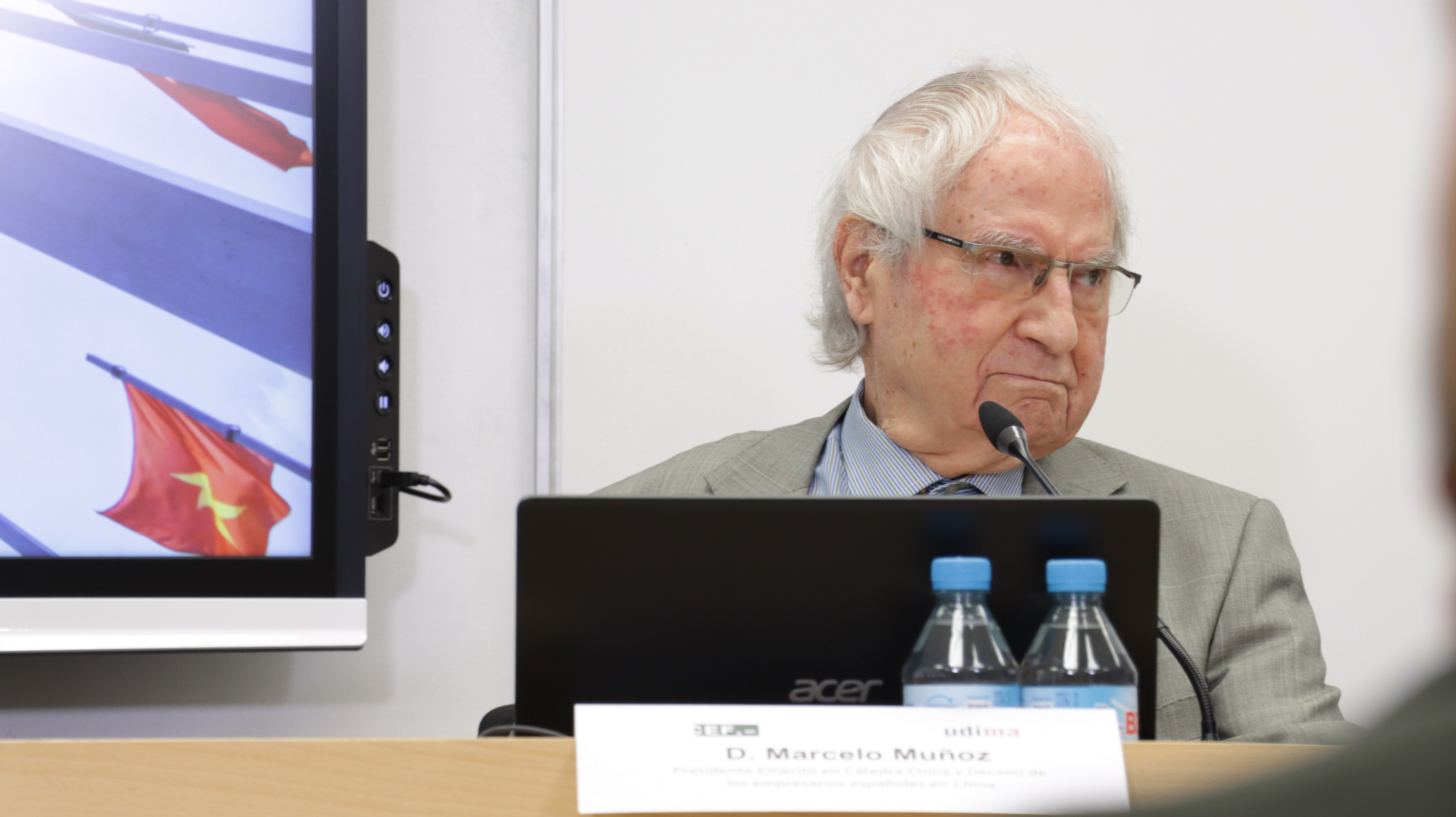 El invitado "de lujo" como el propio De las Heras reconoció, fue el presidente emérito del think tank Cátedra China, Marcelo Muñoz. Este "decano de los empresarios españoles en China", como lo describiría más tarde Felipe Debasa (doctor en historia y director de la Cátedra CEF.- UDIMA Nueva Ruta de la Seda de la UDIMA), demostró por qué es una de las personas que más conoce las relaciones España-China. Su magistral intervención expuso argumentos históricos, económicos, políticos y filosóficos para sostener (como titula su último libro) que "China ha vuelto para quedarse".