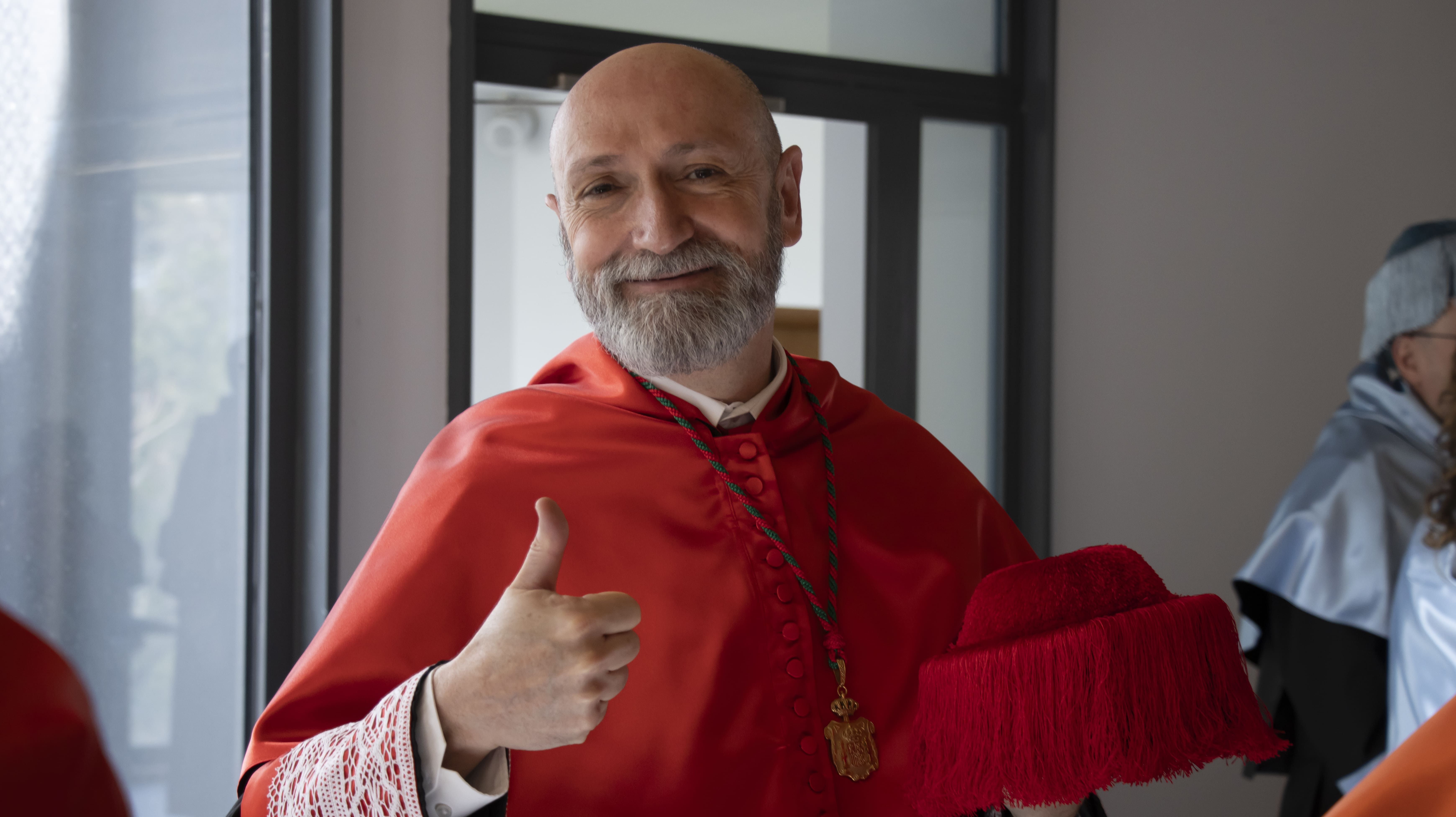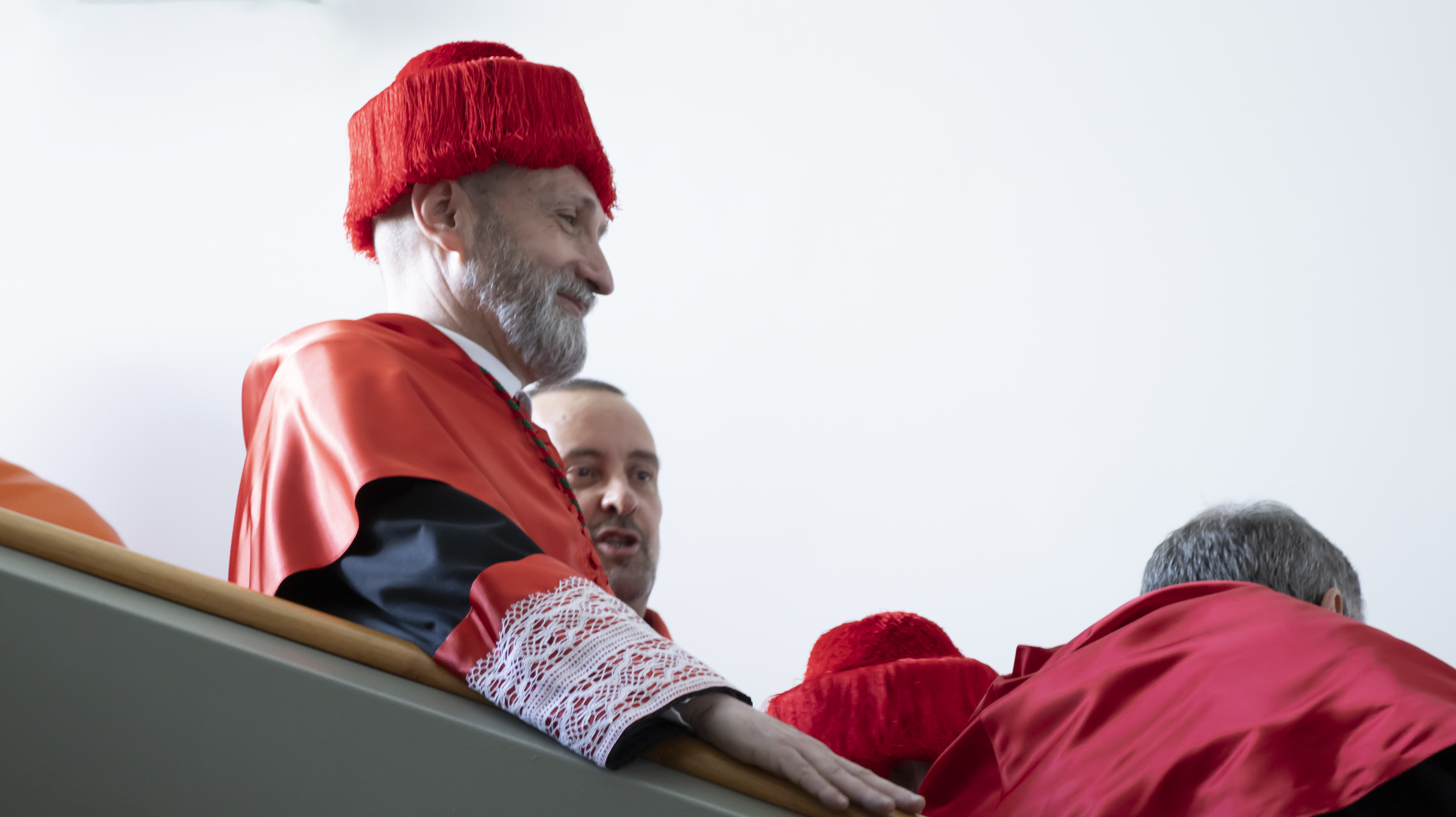 De los 17 nuevos doctores que recibieron su birrete y su abrazo (bienvenidos por Andrés Delgado, director del programa de doctorado en Derecho y Sociedad de UDIMA), el rector Lanzadera convidó, de manera sorpresiva y fuera protocolo, a Ramón Tinao Llerandi (doctorado en La restitución de la posesión de la vivienda en los procesos de desahucio. ¿Protección del legítimo poseedor o del ocupante?) para que hablase en nombre de todos ellos. El doctor agradeció especialmente al presidente honorífico de CEF.- UDIMA, Roque de las Heras, por haberle animado a dedicarse a la docencia: "Gracias a esa persona, dos décadas después estoy aquí, con tan insignes compañeros".