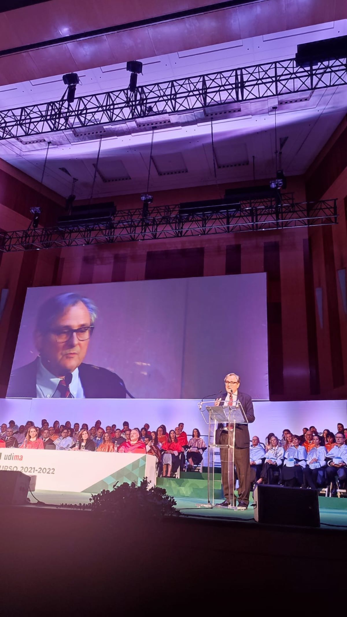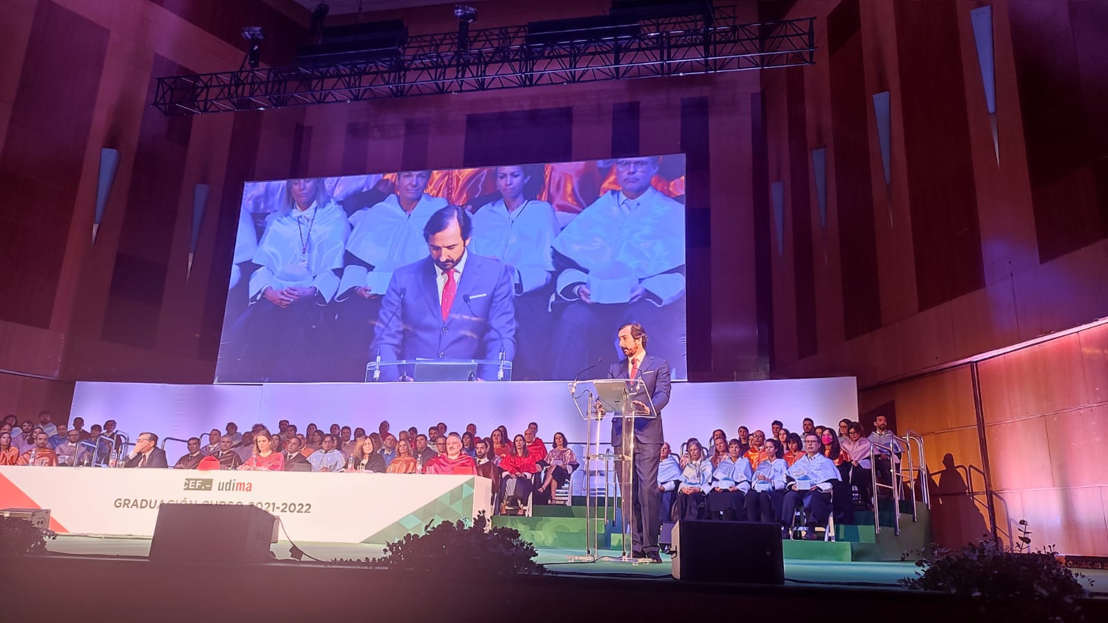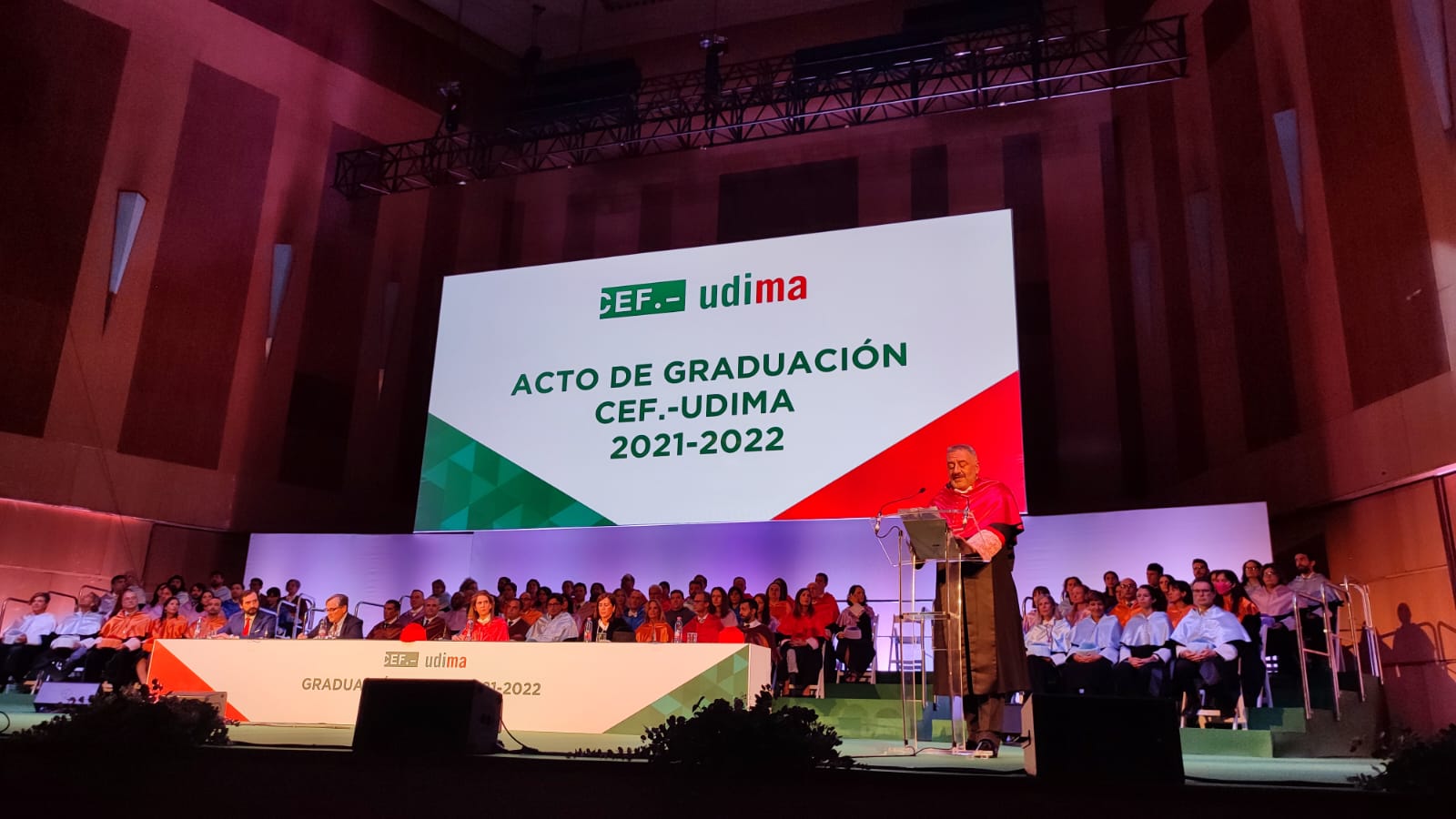 El presidente aplaudió la dupla profesional y docente que desempeñan muchos de los profesores del Grupo Educativo, y alentó a los titulados a formar parte no sólo de los ya más de 600.000 estudiantes de la institución, sino también de los que se hermanan con ella a través de la asociación Alumni+ CEF.- UDIMA de antiguos alumnos.
