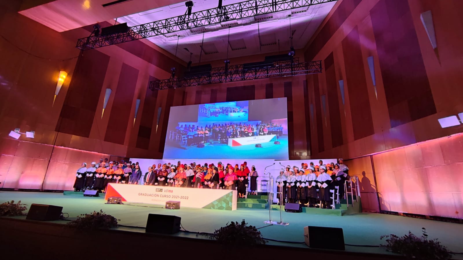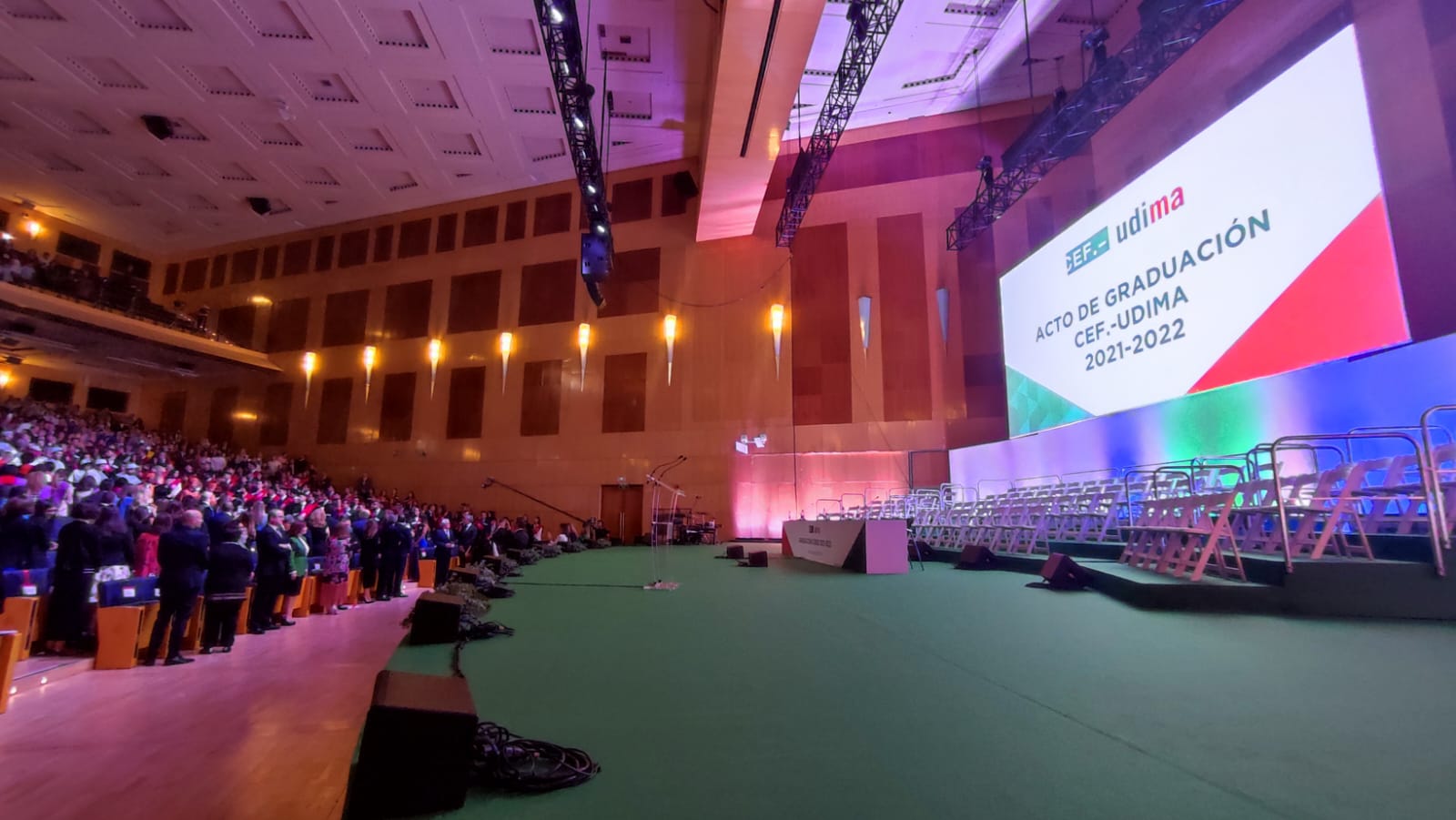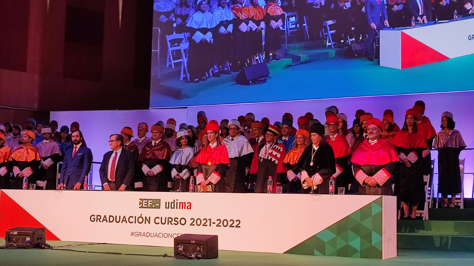 El Palacio Municipal de IFEMA en Madrid acogió un año más el acto de graduación para poner el broche a otro año académico en el Grupo Educativo CEF.-UDIMA. El tradicional Venite Creator, para abrir, y el Gaudeamus Igitur para cerrar el acto escenificaron brevemente el orgullo y esfuerzo de los 3.171 graduados y alumnos de Máster del curso 2021-2022. Una jornada de celebración encabezada por los presidentes del Grupo Educativo, Arancha y Arturo de las Heras, así como de la rectora de la UDIMA, Concha Burgos; su secretario general, Eugenio Lanzadera, y el padrino de la promoción, el profesor y periodista Francisco Marhuenda.