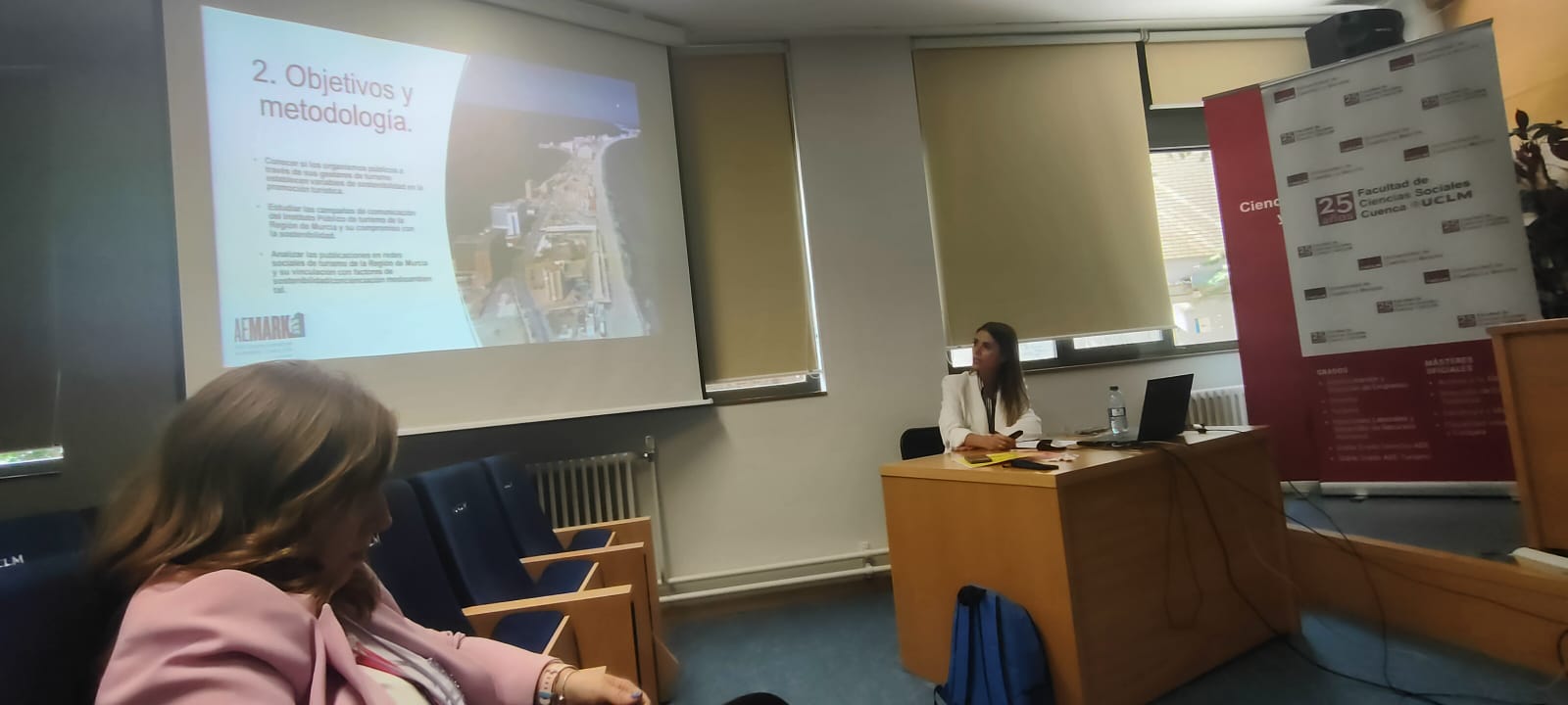 La exposición de la primera comunicación, titulada ‘¿Siguen las campañas de promoción turística en redes sociales una perspectiva de sostenibilidad? Análisis del destino turístico de La Manga del Mar Menor (Murcia)’, corrió por cuenta de la doctora María Alcolea.