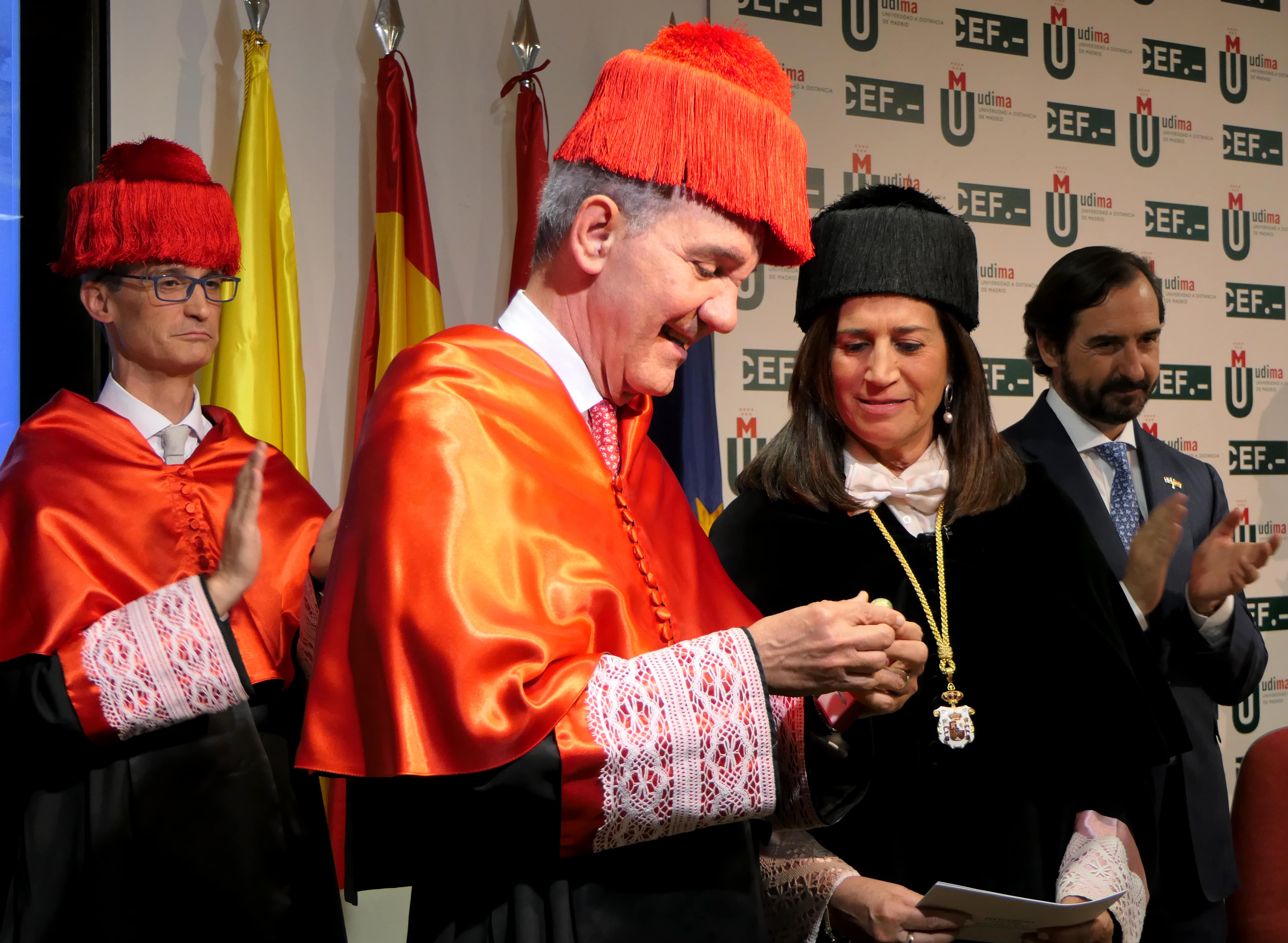 Junto a la rectora de la UDIMA, estuvieron en la Mesa Presidencial del evento, que acogió el Salón de Actos del Campus de la UDIMA, en Collado Villalba (Madrid), los presidentes del Grupo Educativo CEF.- UDIMA, Aránzazu de las Heras -quien cerró el solemne acto- y Arturo de las Heras; así como el secretario general de la institución académica, Eugenio Lanzadera. Asistieron, entre otros invitados, la rectora de CEF.- Santo Domingo, Patricia Portela; el embajador de República Dominicana en España, Juan Bolívar ; el Cónsul General, Miguel Vásquez Peña; el vicerrector académico de CEF.- Santo Domingo, Antonio Reina o el director de Relaciones Internacionales del grupo educativo, Fredy Araujo.