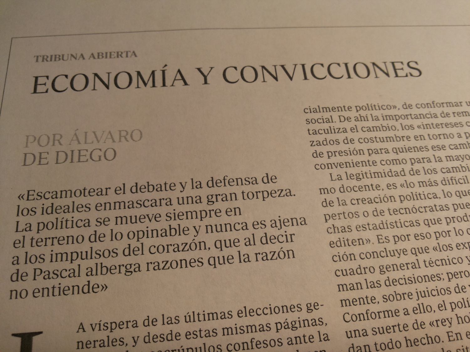El decano de la Facultad de Ciencias Sociales y Humanidades de la Universidad a Distancia de Madrid (UDIMA), Álvaro de Diego, publicó el martes 27 de octubre ‘Economía y convicciones’, su última ‘Tribuna Abierta’ en el centenario rotativo ‘ABC’. Sobre la base de una conferencia pronunciada por un profesor de Ciencia Política, De Diego evalúa tangencialmente la política económica del Gobierno de Mariano Rajoy en relación directa con la de comunicación, que percibe disonante.