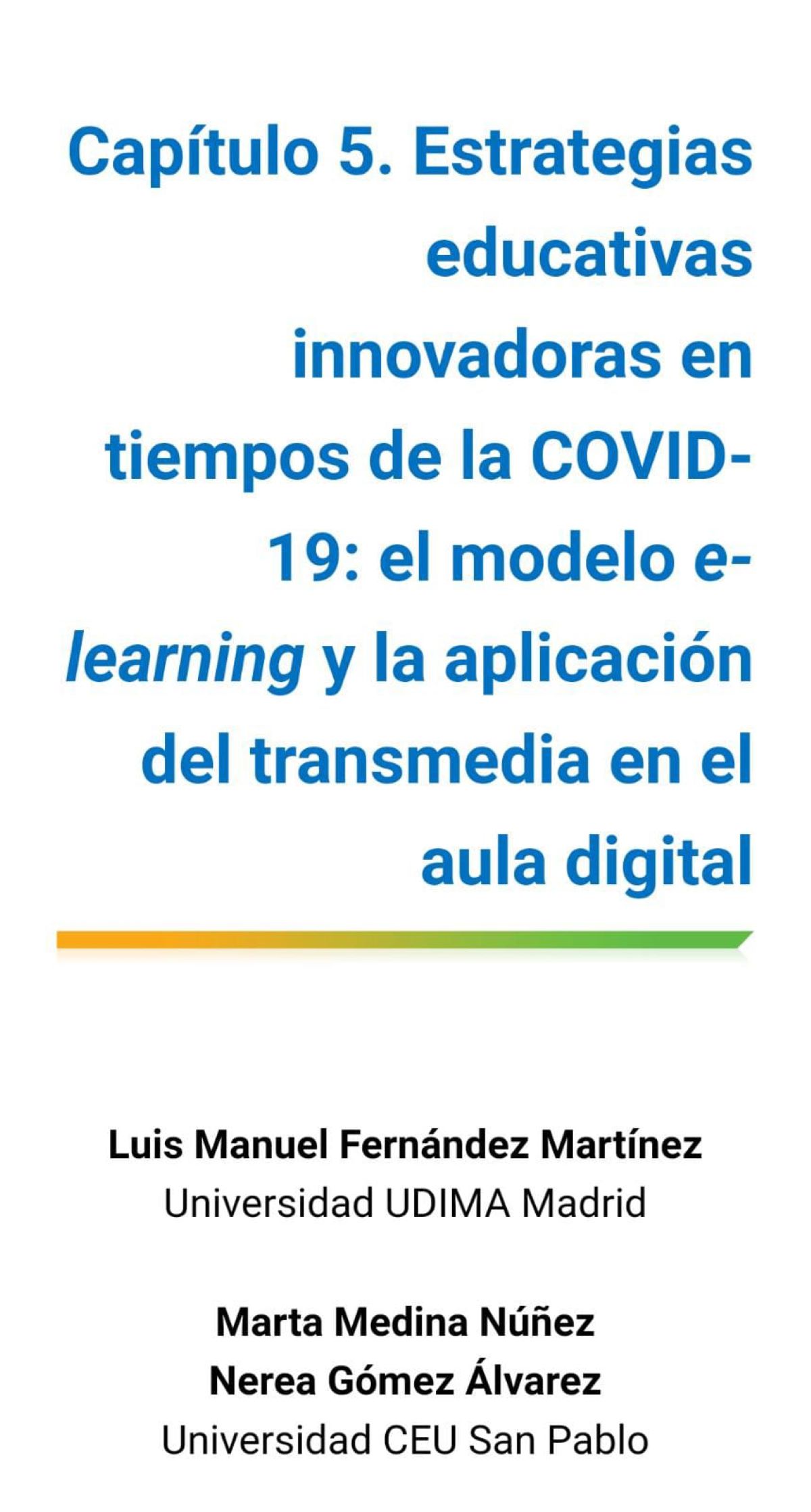 Así se expone en el trabajo ‘Estrategias educativas innovadoras en tiempos de la COVID-19: el modelo e-learning y la aplicación del transmedia en el aula digital’ desarrollado por el profesor de la Universidad a Distancia de Madrid, UDIMA, Luis Manuel Fernández Martínez, junto a Marta Medina Núñez y Nerea Gómez Álvarez, ambas investigadoras de la Universidad CEU San Pablo.