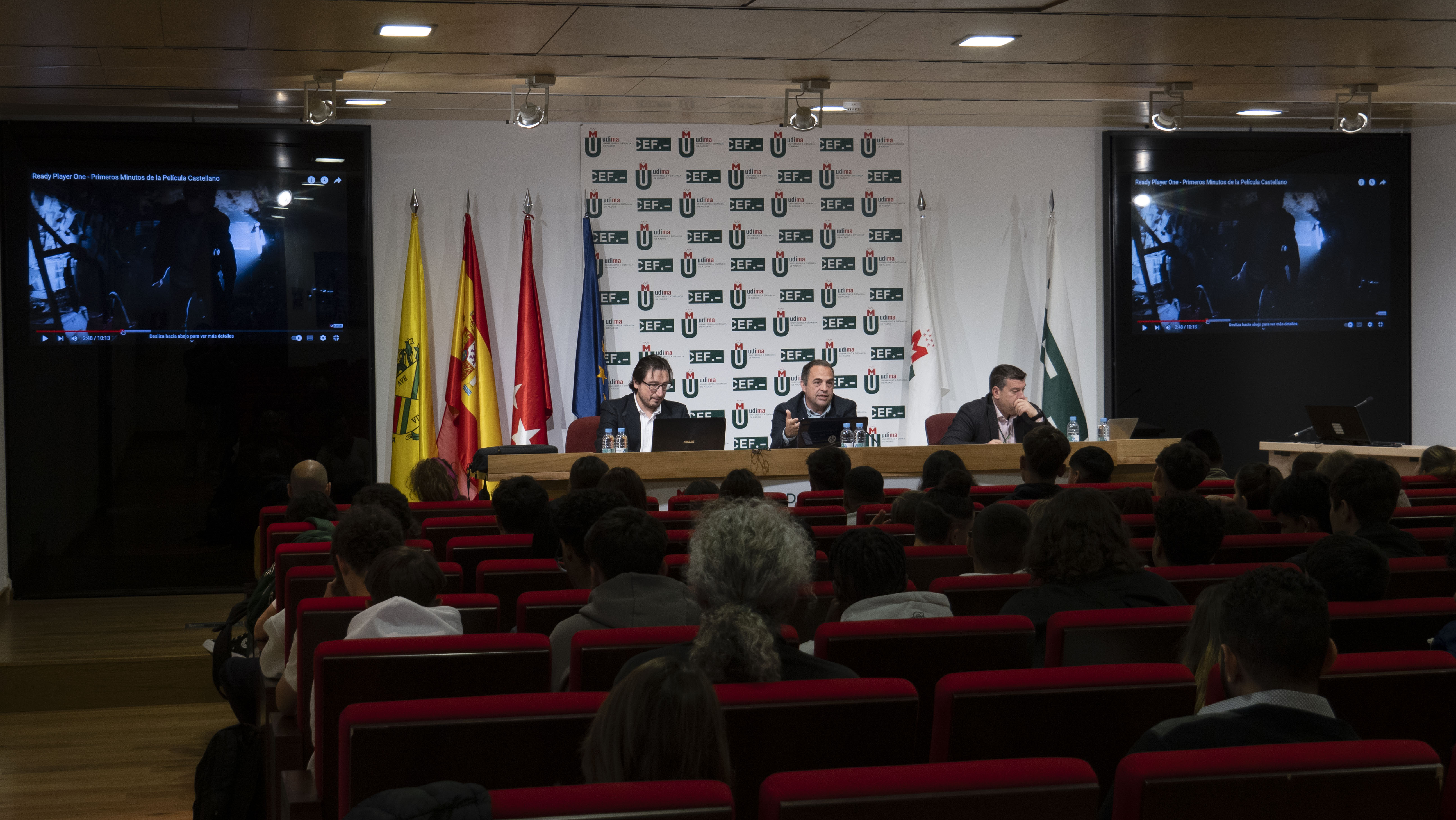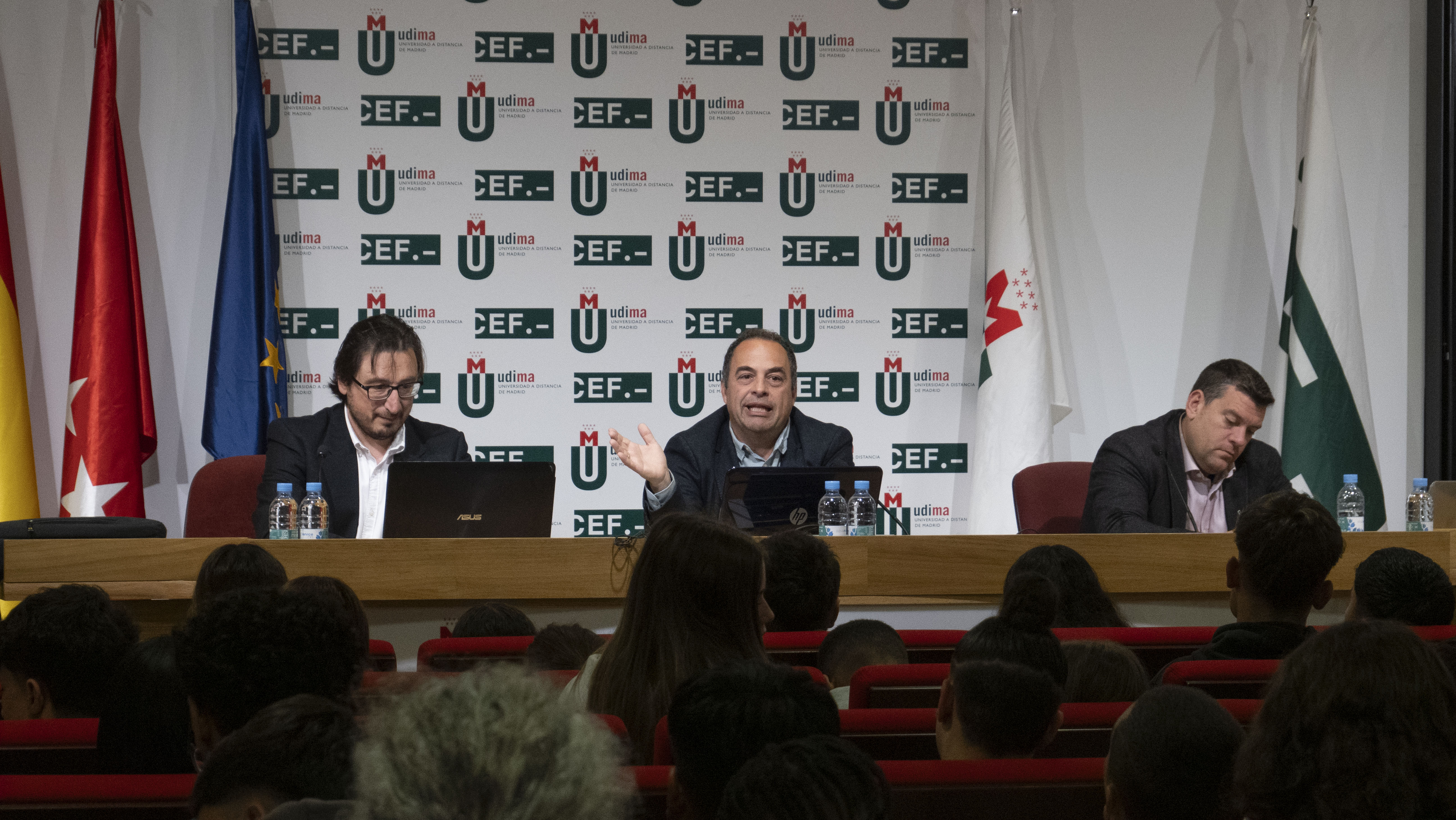 Tras la charla de Roque de las Heras, Julián Roa González, Decano de la Facultad de Ciencias de la Salud; Isaac Seoane Pujol, Decano de la Escuela de Ciencias Técnicas e Ingeniería; y Abel González García, Director del Departamento de Criminología, todos de la UDIMA, impartieron una charla a los estudiantes sobre los peligros y las oportunidades de la Inteligencia Artificial, haciendo hincapié en las nuevas posibilidades de emprendimiento que están surgiendo gracias a los grandes avances que se están produciendo en esta área.