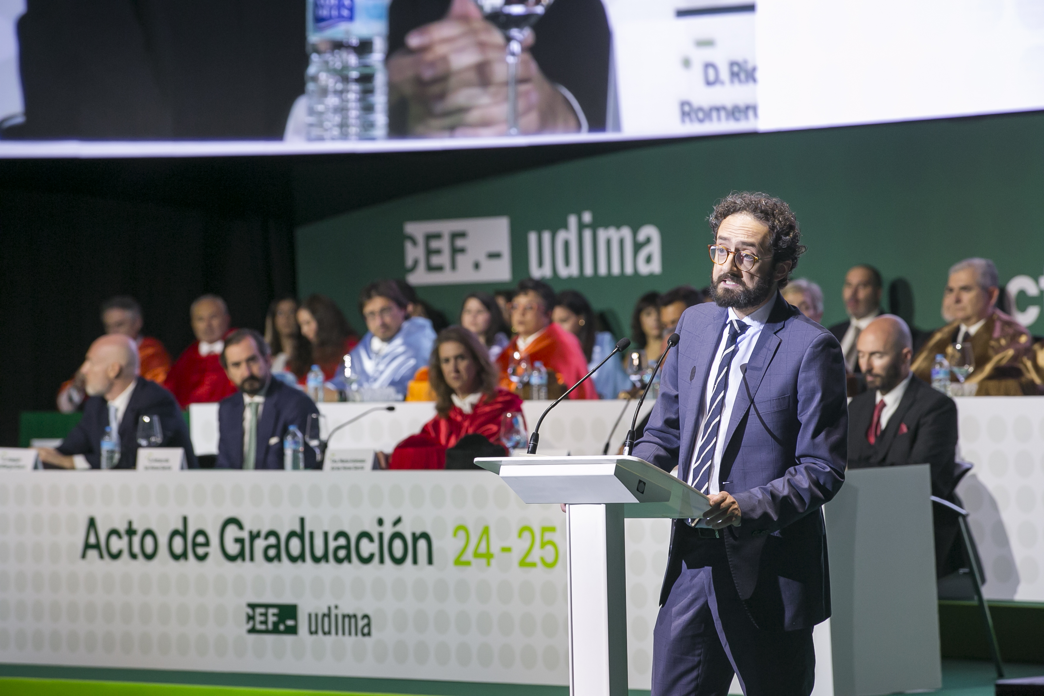 El periodista y director del diario El Mundo, Joaquín Manso, antiguo alumno del Grupo Educativo CEF.- UDIMA, ejerció como padrino de la promoción 2024-2025. En un discurso inspirador, apeló al compromiso cívico, al pensamiento crítico y al poder transformador del conocimiento, animando a los egresados a afrontar el futuro con valentía y responsabilidad.