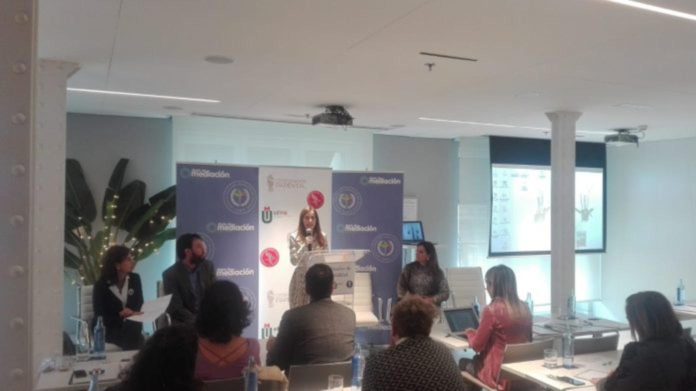 Diario de Mediación, el encuentro fue presentado por la directora de la Escuela de Mediación, María Herrero Villanueva, a quien acompañaron los coordinadores académicos del título de Experto en Coordinador Parental que oferta la UDIMA, Santiago Madrid Liras, Carmen Capilla Rodríguez y Álvaro Rubio Álvarez.