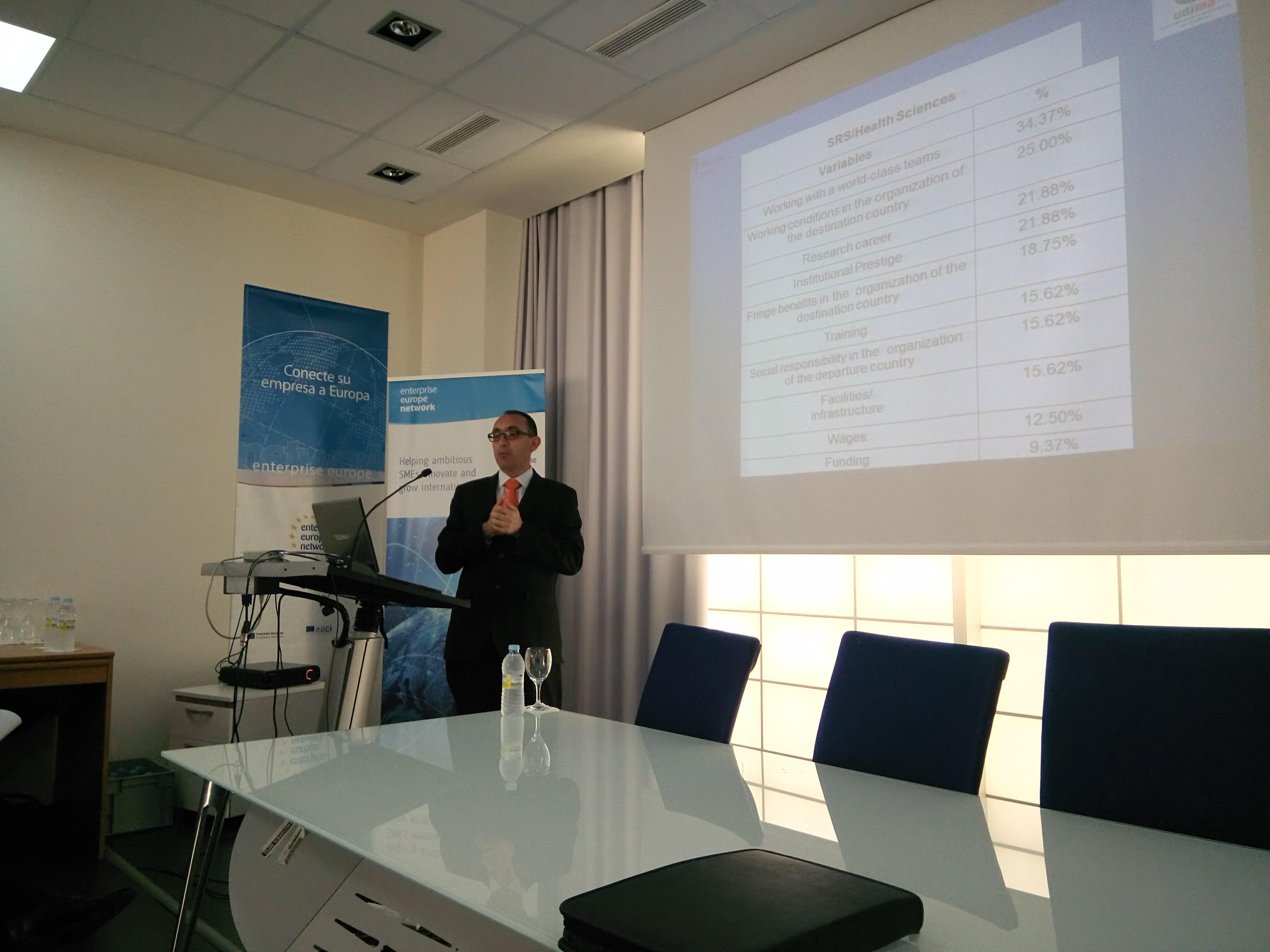 Para los investigadores postdoctorales se presentó el programa Intertalentum desarrollado en el marco del Campus de Excelencia Internacional UAM+CSIC. Como ejemplo concreto, la Asociación de Científicos Españoles en el Reino Unido (CERU) explicó las oportunidades y condiciones que ofrece el país y su trabajo para crear puentes entre la ciencia británica y la española para hacer llegar la ciencia a la sociedad. De igual modo se habló de la red Enterprise Europe Network, la cual introdujo Jesús Rojo, coordinador de la red EEN madrimasd.