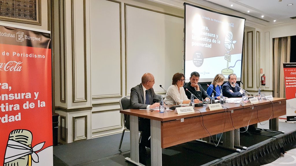 Sobre posverdad giró la segunda de las mesas redondas, posterior a la que abordó la titulada ‘Censuras y autocensuras’ en la que, moderados por la presidenta de la Federación de Asociaciones de la Prensa de España (FAPE), Elsa González, participaron David Alandete, director adjunto de ‘El País’; Jesús Maraña, director editorial de ‘InfoLibre’; José Miguel Contreras, catedrático de Comunicación Audiovisual y fundados de laSexta, y Vicente Vallés, director y presentador de ‘Noticias 2’ de Antena 3. La bienvenida corrió por cuenta del presidente de la APE, Diego Carcedo, y el director de Comunicación y Relaciones Públicas de Coca-Cola Iberia, Pelayo Bezanilla.