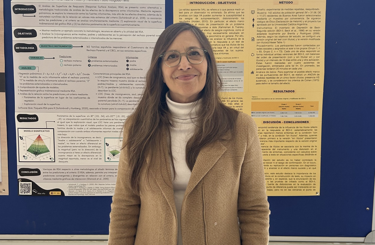 Por su parte, la profesora Elena Brenlla abordó el tema del ‘Efecto Marco en la construcción y adaptación de tests’, centrándose en la validez aparente y su relación con sesgos cognitivos, como el efecto marco. Su estudio, basado en el Beck Depression Inventory-II (BDI-II), reveló que la enunciación de los ítems afecta las respuestas de los participantes, sugiriendo la importancia de considerar los sesgos cognitivos en la construcción de pruebas psicométricas.