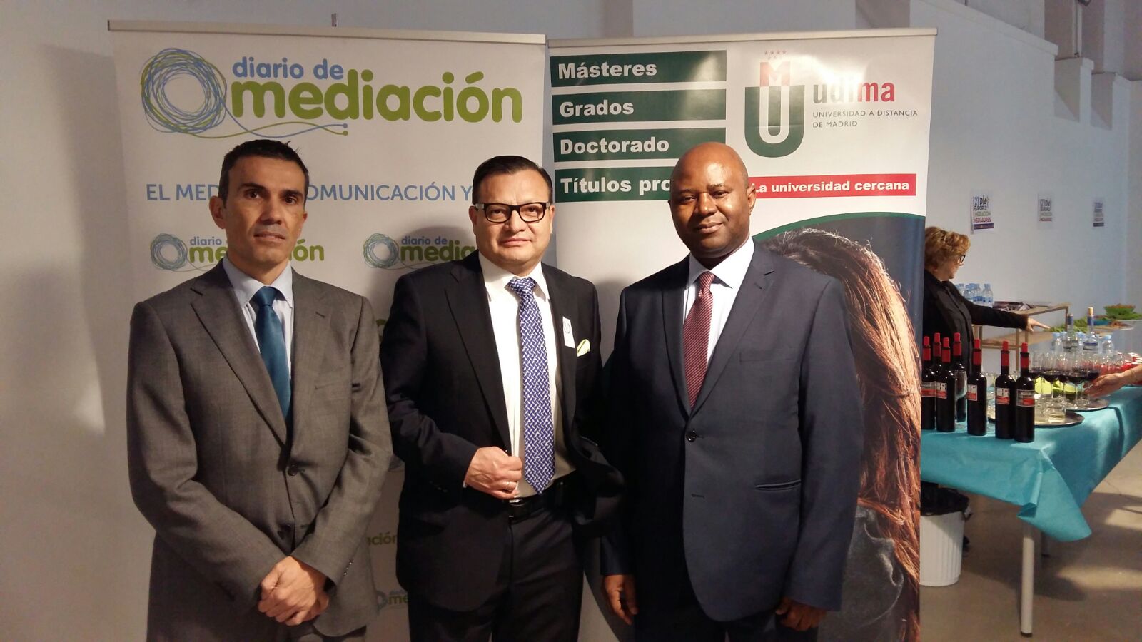 El vicerrector de Relaciones Universidad-Empresa de la Universidad a Distancia de Madrid (UDIMA), Juan Luis Rubio, junto al doctor en Psicología y también docente de la Universidad Richard Mababu, han representado a la institución académica en el acto de entrega de las 'Medallas al Mérito Profesional' a todos aquellos profesionales del mundo de la Mediación, del ámbito nacional e internacional, como reconocimiento a su labor y compromiso en impulsar la Mediación durante el año 2016, en el marco del III Aniversario de 'Diario de Mediación' y coincidiendo con la Semana Europea de la Mediación.