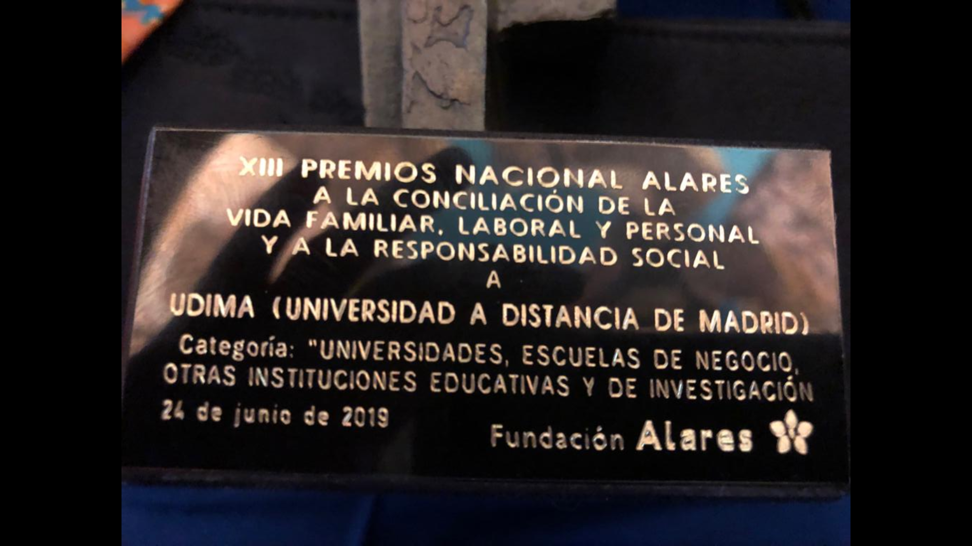 La Universidad a Distancia de Madrid, UDIMA, fue distinguida este lunes con el Premio Alares en la categoría de 'Universidades, Escuelas de Negocio, Otras Instituciones Educativas y de Investigación', en el marco de los XIII Premios Nacionales Alares a la Conciliación de la Vida Familiar, Laboral y Personal y a la Responsabilidad Social.