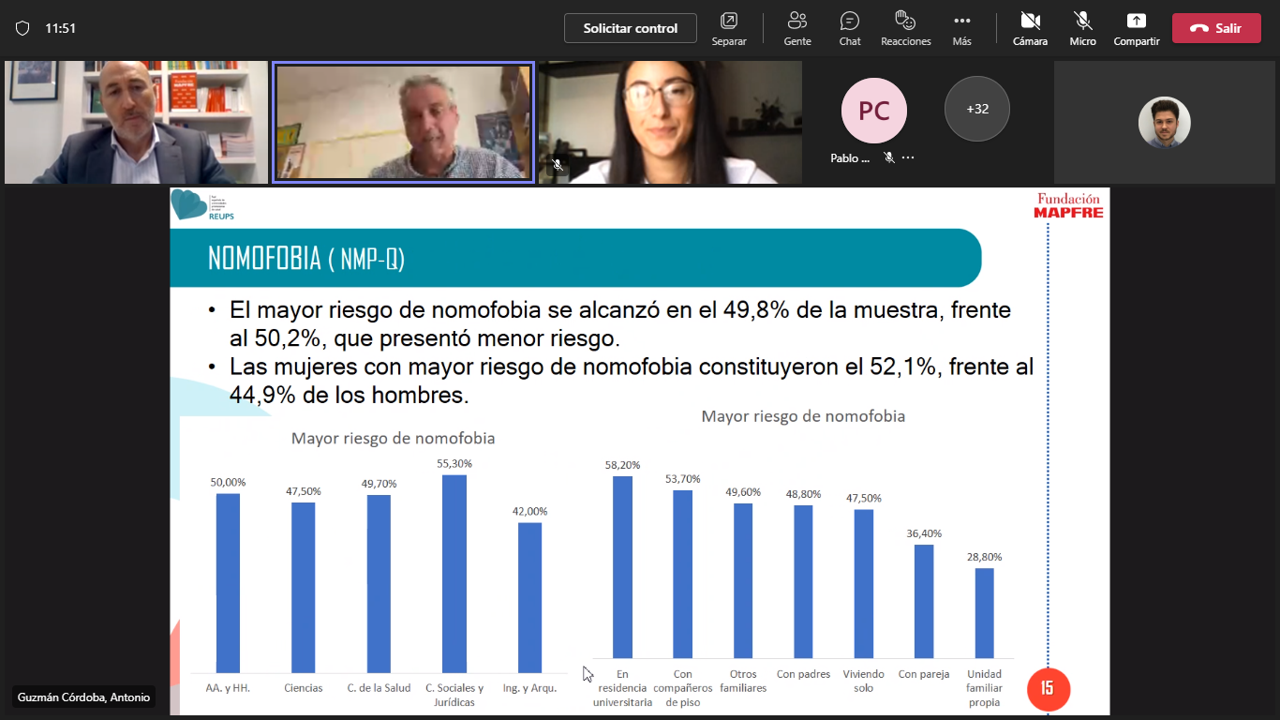 El estudio intenta dibujar el riesgo del alumnado a sufrir nomofobia (no mobile phobia o miedo a no poder usarlo, quedarse sin batería o a no poder conectarse a internet). Y aunque los autores del estudio dicen que la puntuación de las respuestas obtenidas en este sentido es "inferior a la media del cuestionario", (lo que "podría indicar baja probabilidad" de sufrir esa nomofobia), hay afirmaciones concretas en su uso que sí son bastante frecuentes entre los estudiantes; ejemplos del "uso problemático" del móvil, indica el texto.