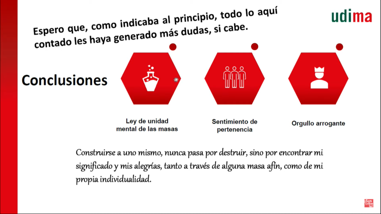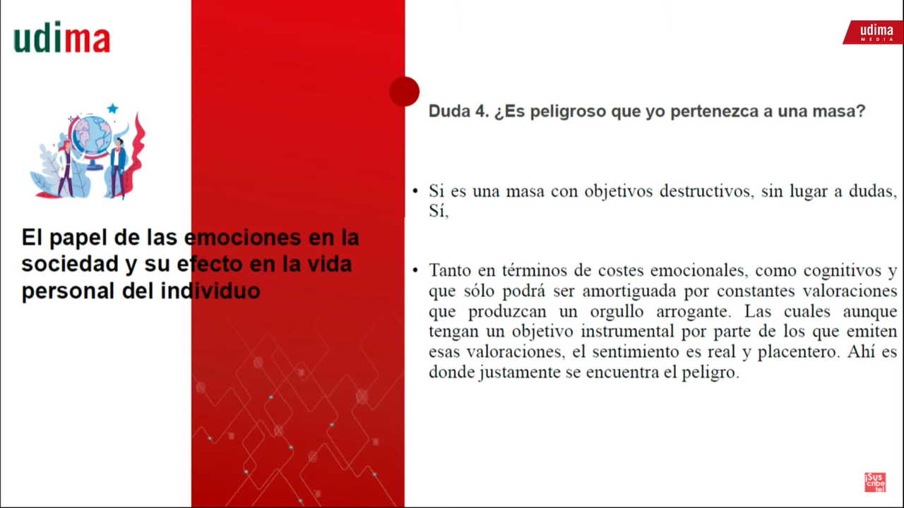 Es decir, lo que el doctor en Psicología traía a colación buscaba ante todo una reflexión sobre El papel de las emociones en la sociedad y su efecto en la vida personal del individuo. Con este título el profesor de la UDIMA explicó brevemente el funcionamiento de las emociones en las masas, y cuándo hay que tener cuidado si pertenecemos a una. Porque una de las primeras características de la masa es que es resistente al cambio y se acelera por momentos con tal de lograr el objetivo que persiga, sea bueno o no tanto...