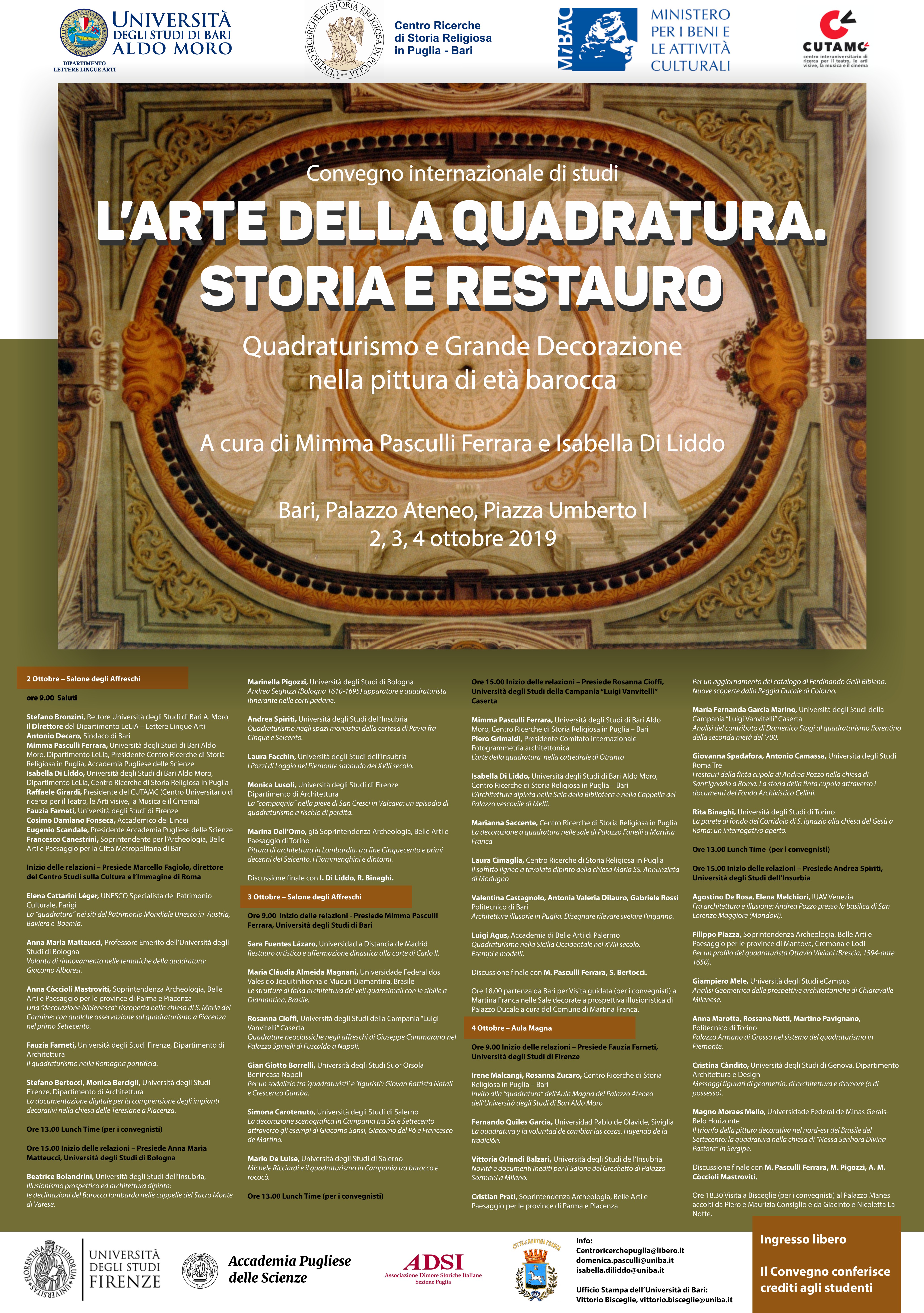 En esta edición, el evento académico ha estado dedicado al tema de ‘L’arte della Quadratura. Storia e Restauro’, organizado por las profesoras Mimma Pasculli Ferrara e Isabella Di Liddo en la Università degli Studi di Bari Aldo Moro.
