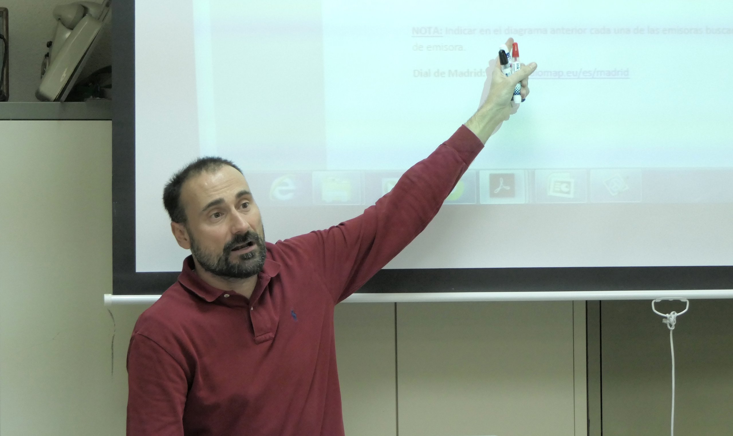 Por su parte, en el laboratorio de comunicaciones, de la mano del profesor Antonio Villaverde y del de Salesianos Juan Gallardo, se celebraron prácticas de instrumentación de comunicaciones y modulaciones, en las que se realizaron experimentos de transmisión y recepción de señales de radiodiodifusión y televisión analógicas y digitales, analizando las modulaciones que permiten transmitir los actuales servicios de TDT y sus formas de onda y anchos de banda en un analizador de espectro.