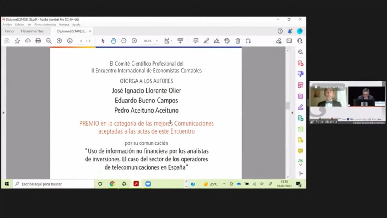 El Consejo General de Economistas de España (CGE) ha premiado la comunicación sobre información no financiera presentada por tres profesores de la Universidad UDIMA en el II Encuentro Internacional de Economistas Contables, celebrado en febrero. Los docentes José Ignacio Llorente Olier, Eduardo Bueno Campos y Pedro Aceituno Aceituno recibieron uno de los seis galardones entregados en el evento online al que asistieron personalidades y expertos contables para reflexionar sobre los retos y tendencias del sector.