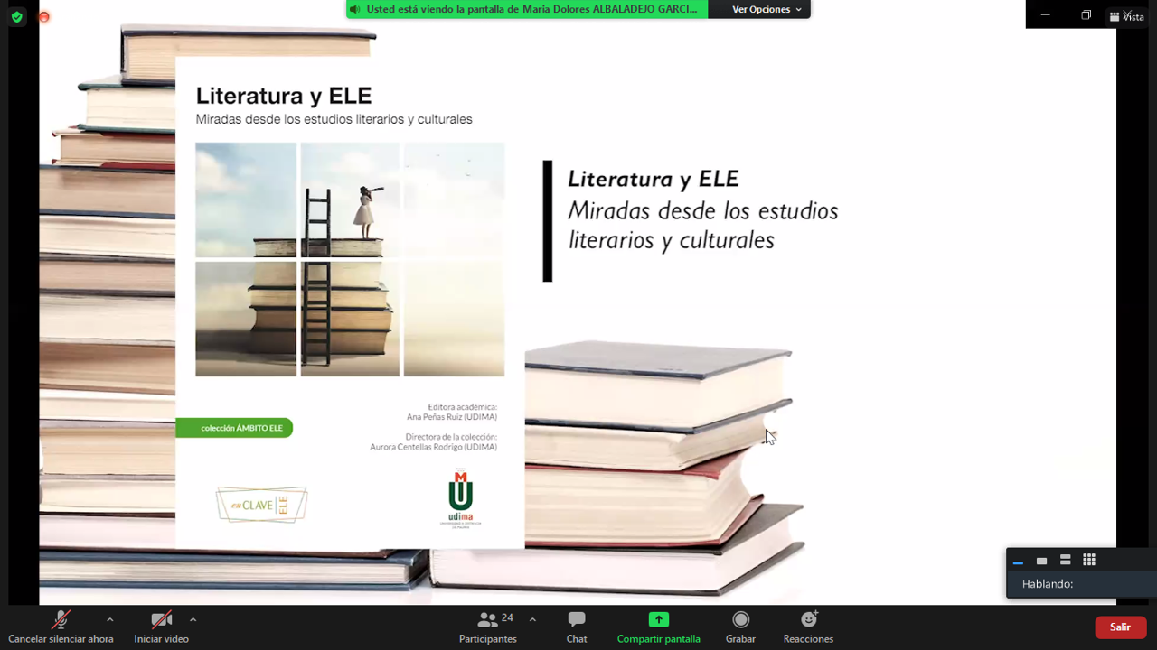 "Pero con otras ropas". Con este mensaje optimista y esperanzador, la profesora María Dolores Albaladejo iniciaba la presentación online del libro Literatura y ELE: miradas desde los estudios literarios y culturales bajo el amparo del Instituto Cervantes - Argel. La coautora participó en una exposición múltiple junto con algunos de los 13 expertos nacionales e internacionales que han intervenido en la elaboración del libro.