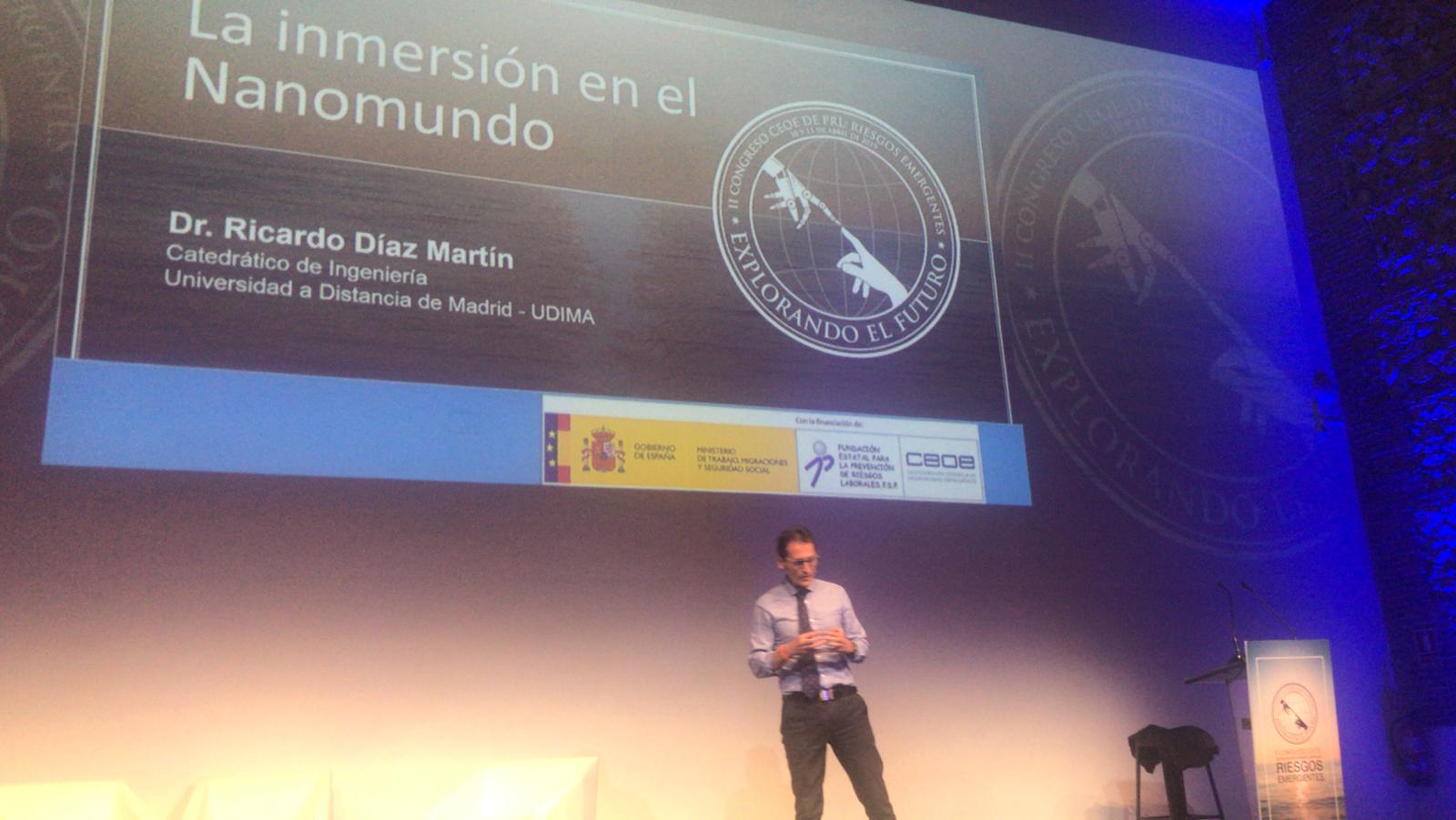 Díaz impartió una ponencia sobre las nanopartículas en el entorno de la seguridad e higiene laboral dentro del II Congreso CEOE de Prevención de Riesgos Laborales: Riesgos Emergentes que acogió La Real Fábrica de Tapices.