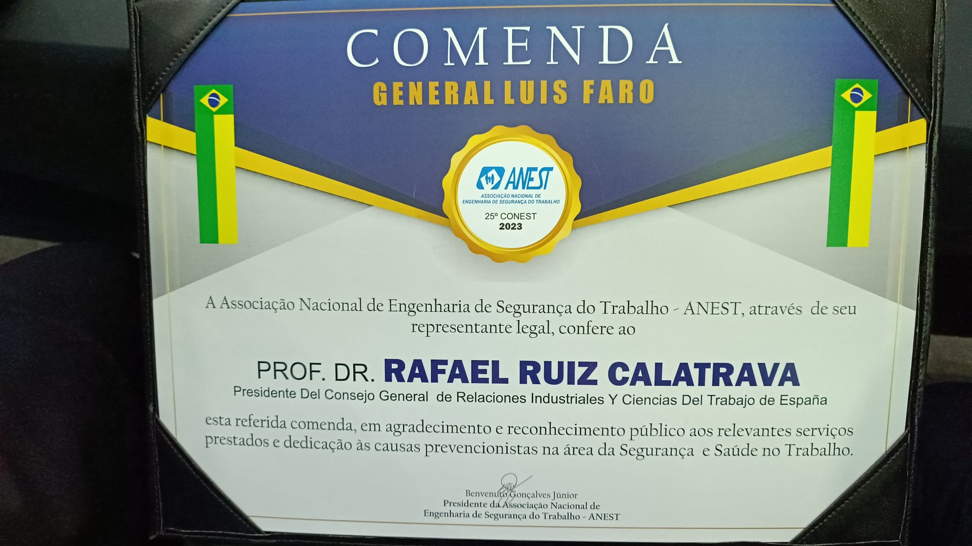 En paralelo, en su doble condición de presidente del Consejo General de Relaciones Industriales y Ciencias del Trabajo de España, el profesor Ruiz Calatrava recibió la ‘Comenda General Luis Faro’, máxima distinción de la Asociación Nacional de Ingeniería de Seguridad Ocupacional (ANEST), junto con la Asociación de Ingeniería de Seguridad Ocupacional de Santa Catarina (ACEST), en reconocimiento a su trayectoria profesional y su trabajo en pro de la SST en Iberoamérica.