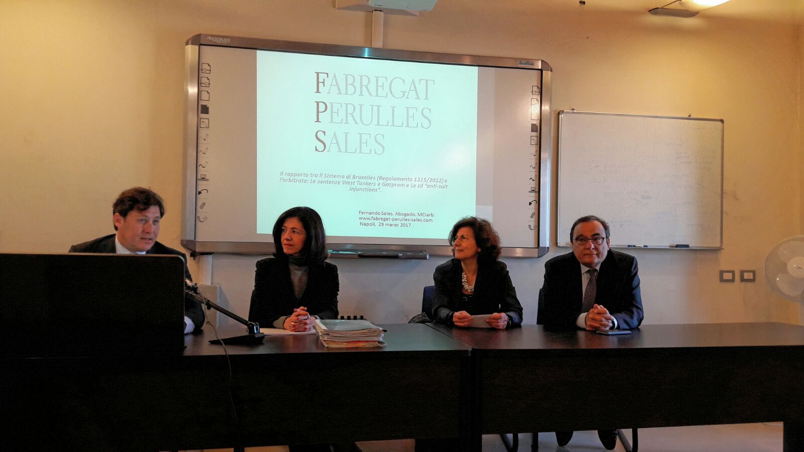 La presentación del Seminario estuvo a cargo de la directora de la Scuola, la profesora Mariavaleria del Tufo, Prorettore de la citada Università. En dicho Seminario, organizado con el patrocinio de la Federation des Barreaux D’Europe (FBE) y la Union Internationale des Avocats (UIA) participaron Lucilla Gatt, profesora de Derecho Privado en la Università Suor Orsola Benincasa y directora ReCEPL; Alessandro Senatore, presidente de la Comisión de Arbitraje en la FBE; Giovani Zarra, profesor agregado de Derecho Internacional Privado y Procesal de la Università Federico II de Nápoles; el abogado Fernando Sales, socio fundador-director del ADR en el Despacho Fabregat Perulles Sales, así como la profesora del Máster de la Abogacía Nazareth Romero, abogada, árbitro internacional MCIARb y socia directora en España de Studio Legale Ovoli Frugoni Romero.