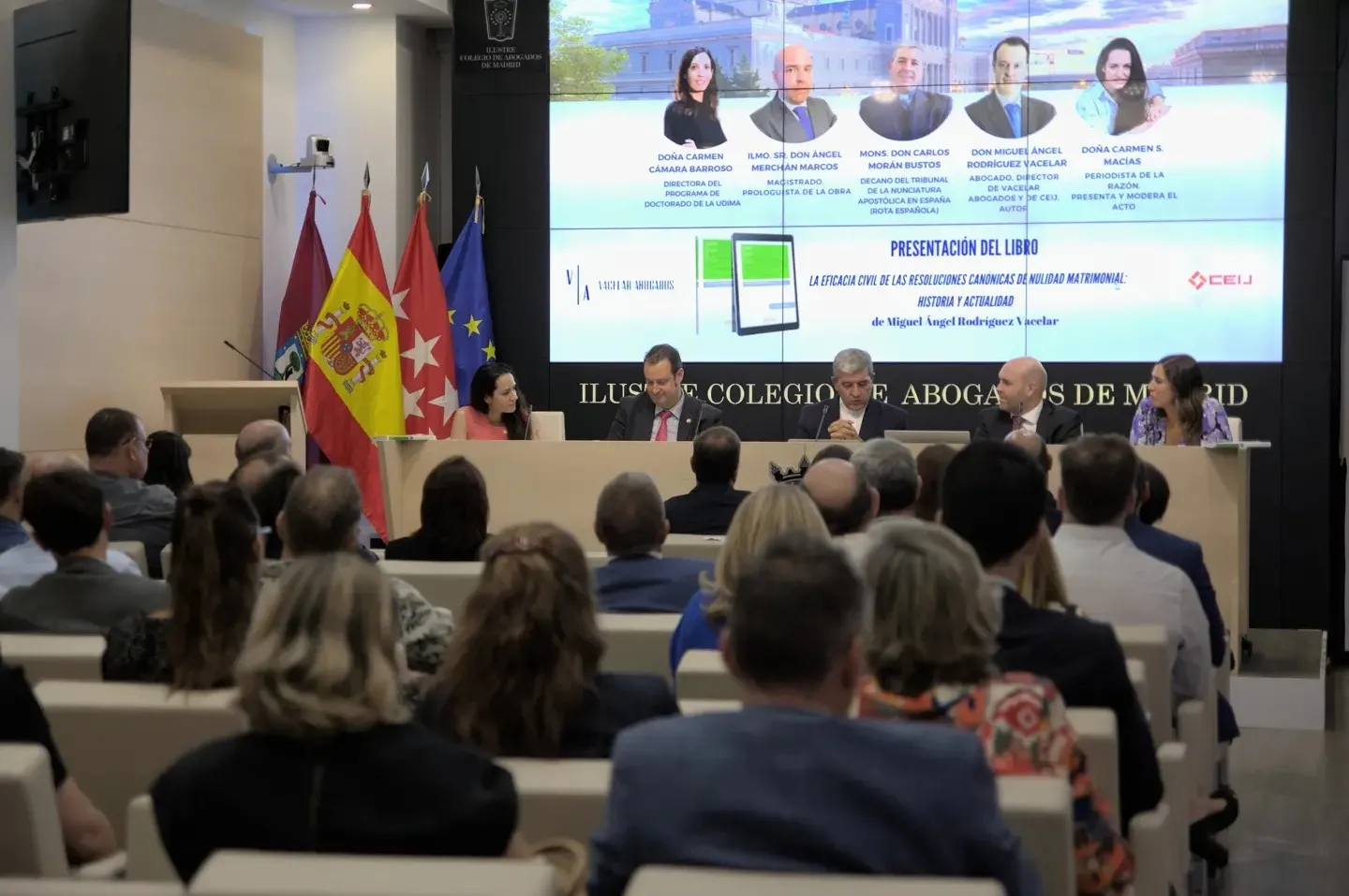 El Salón de Actos del Ilustre Colegio de la Abogacía de Madrid fue el escenario de la presentación, el 9 de septiembre, de la primera obra jurídica del doctor en Derecho y Sociedad por la Universidad a Distancia de Madrid, UDIMA, Miguel Ángel Rodríguez Vacelar, que lleva por título ‘La eficacia civil de las resoluciones canónicas de nulidad matrimonial: Historia y actualidad’ (Thomson-Reuters Aranzadi).
