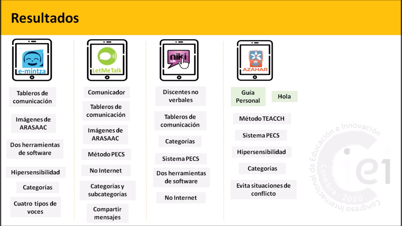 Concretamente, se han escogido cuatro aplicaciones móviles: e-Mintza, LetMeTalk,Niki Talk y Azahar. Tras el análisis de cada una de ellas, se ha podido concluir que son recursos totalmente personalizables e inciden favorablemente en la mejora de las habilidades comunicativas. Por lo tanto, dichos recursos promueven la inclusión educativa y social del alumnado con TEA, facilitando su desarrollo integral.
