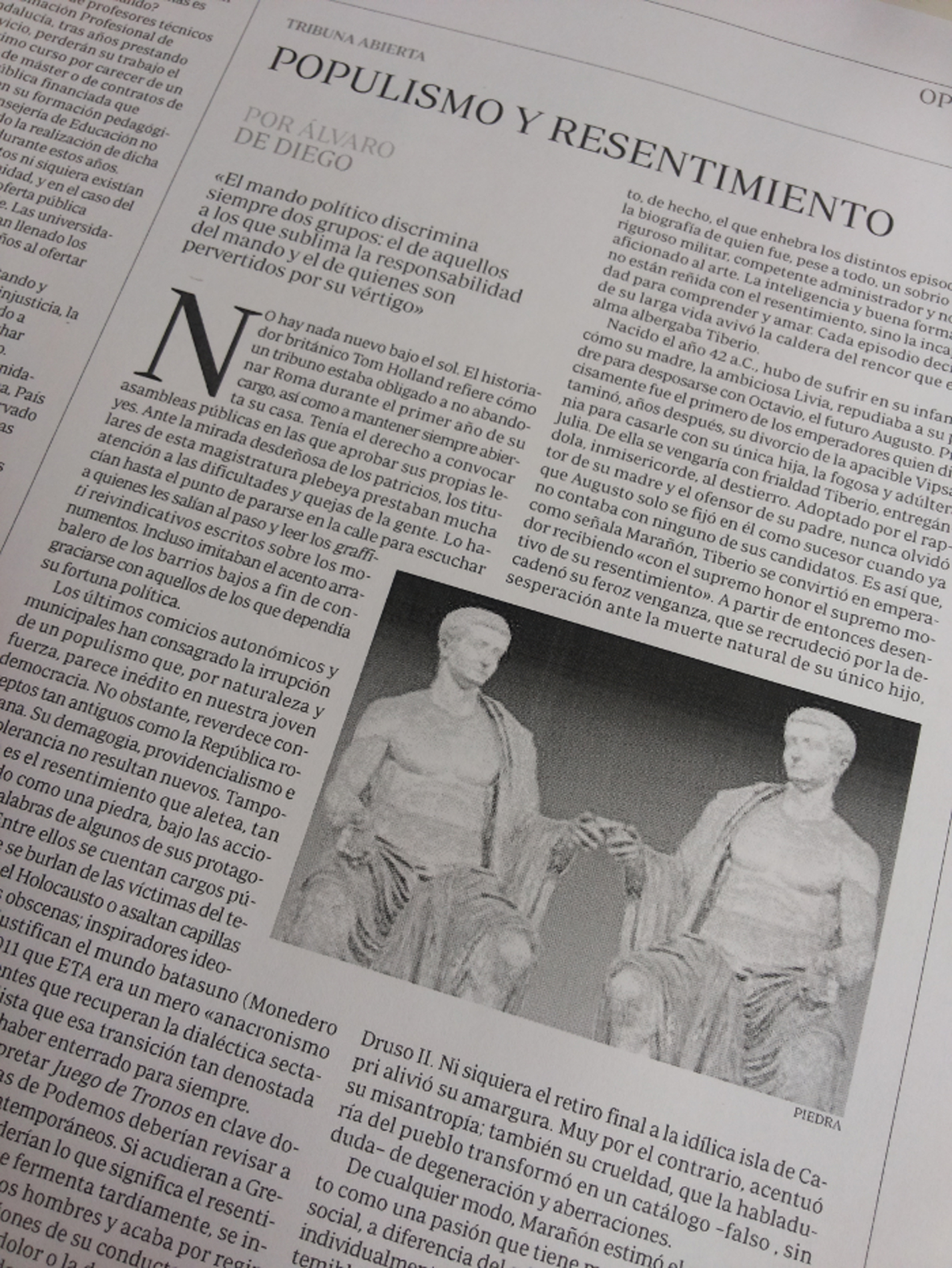 ABC, donde sugiere un paralelismo entre Tiberio y Podemos, a propósito del aparente resentimiento que se desprende de algunas de sus respectivas actuaciones.