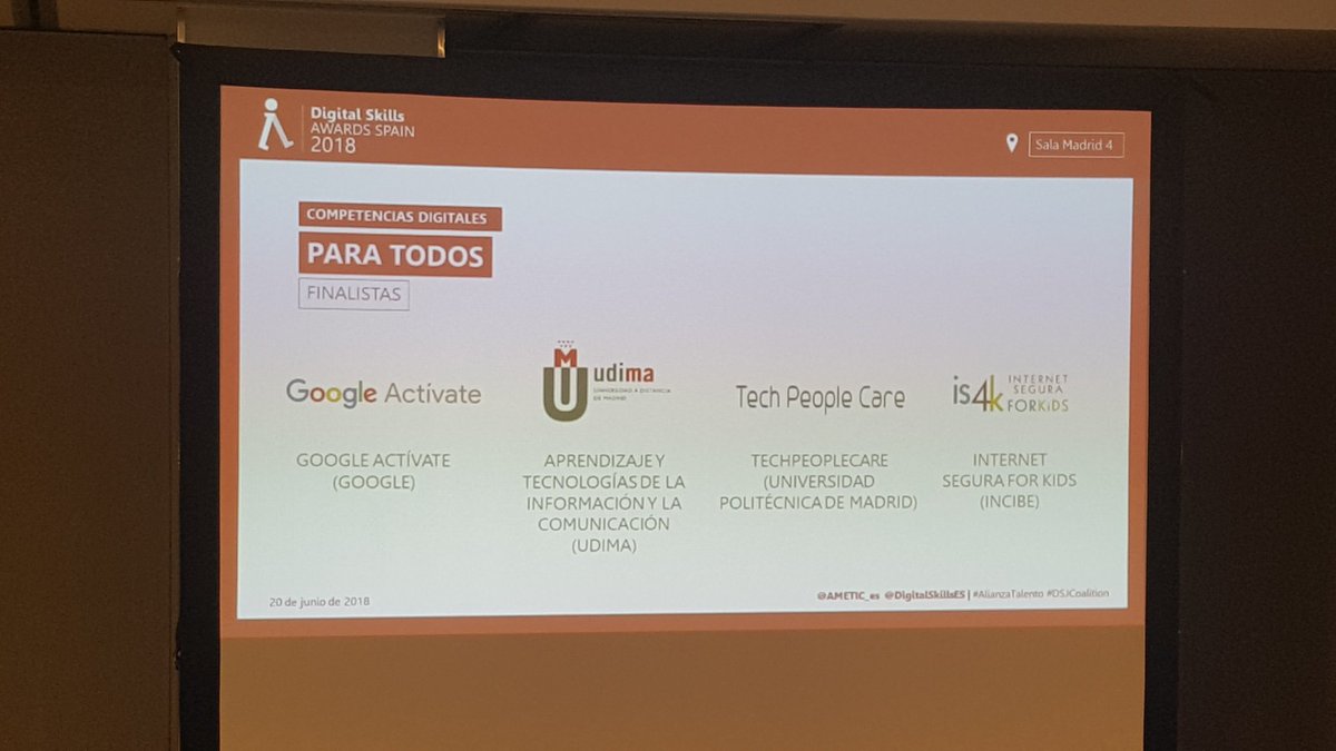 Los finalistas por categorías fueron: Accenture, CISCO, The Key Talent y Capaball (Competencias digitales para el mercado laboral); Samsung, ICEMD, K2 UNIVERSITY (Salesforce Training con la Fundación Universidad Carlos III), y Oracle Academy (Competencias digitales en educación); ASTI Steam, Oracle4Girls, Girls in Tech e Inspira Steam (Competencias digitales para mujeres y niñas); Fundación ONCE Samsung, Talento 4.0 Asti y Consejería de Empleo (Más y mejores profesionales TIC formados); y Google, Universidad a Distancia de Madrid (UDIMA), Universidad Politécnica de Madrid e Incibe (Competencias digitales para todos).