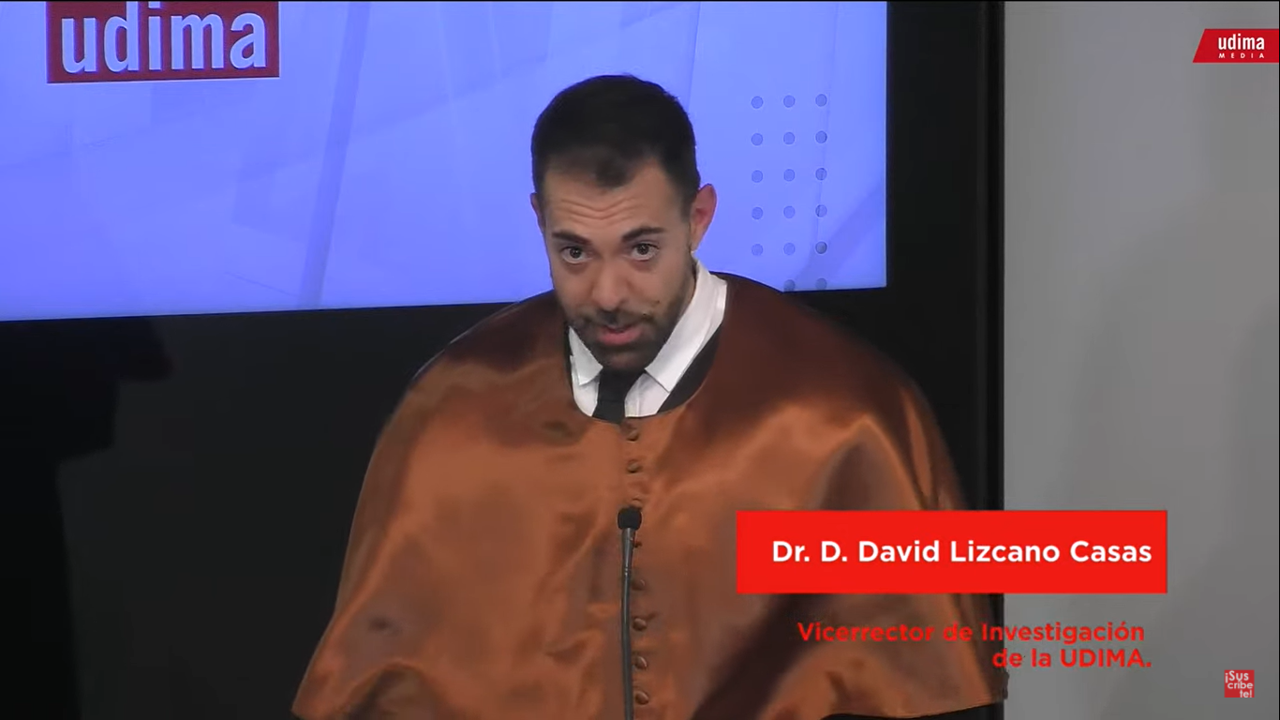 El doctor David Lizcano, que recibió el Premio a la Excelencia Investigadora y de Habilitación como catedrático universitario, recogió el guante para ofrecer una disertación sobre sobre las universidades de investigación. Y para reforzar su argumento de "por qué la UDIMA debería perseguir ser una de ellas". Todo parte de la dicotomía entre investigar y enseñar, que aqueja especialmente a sistemas universitarios como el español.