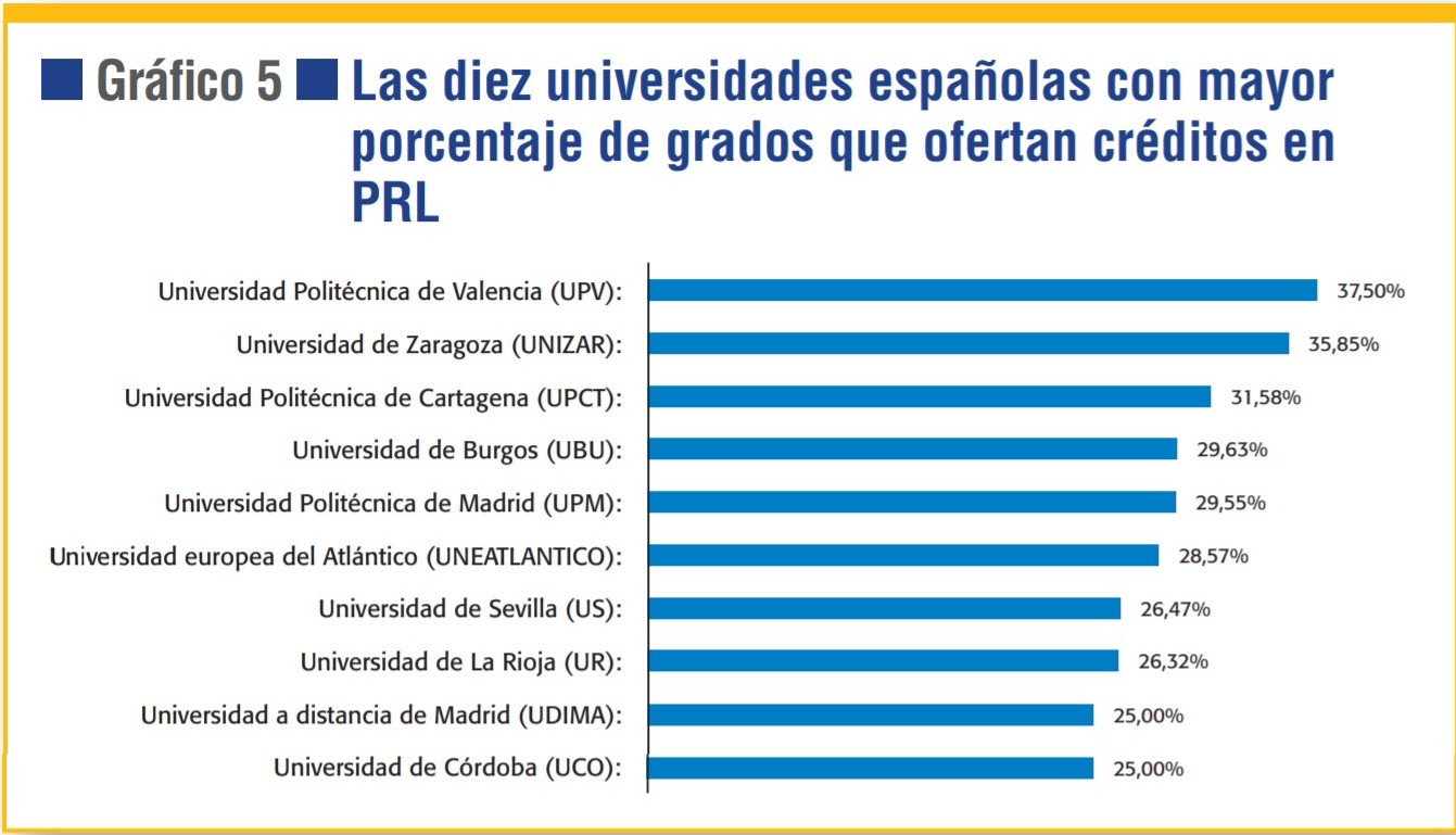 Los autores del estudio enjuician que el nivel actual de la formación sobre PRL en los grados universitarios españoles “es bajo”. En líneas generales, señalan que España tiene alrededor de un 15% de universidades que imparten grados sin ofertar ningún crédito en PRL, y que todas las universidades presentan menos de la mitad de sus grados con créditos relacionados con la PRL, según el número de grados totales que ofertan.