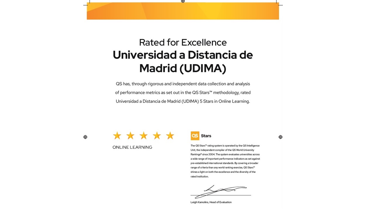 La universidad del Grupo CEF.- UDIMA, ha sido reconocida con el sello QS Online Learning por su labor como institución de enseñanza en línea. La clasificación de Quacquarelli Symonds ha concedido las cinco estrellas de su ranking QS Stars a la universidad del Grupo Educativo en la categoría de Metodologías de Enseñanza en Línea, en la que compiten universidades de todo el mundo. Un espaldarazo a la "experiencia de aprendizaje en remoto sólida y atractiva" que ofrece.